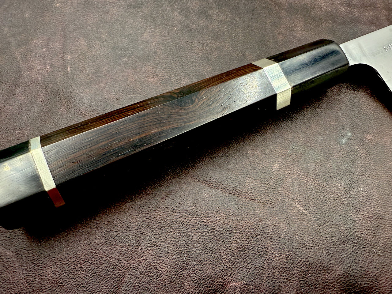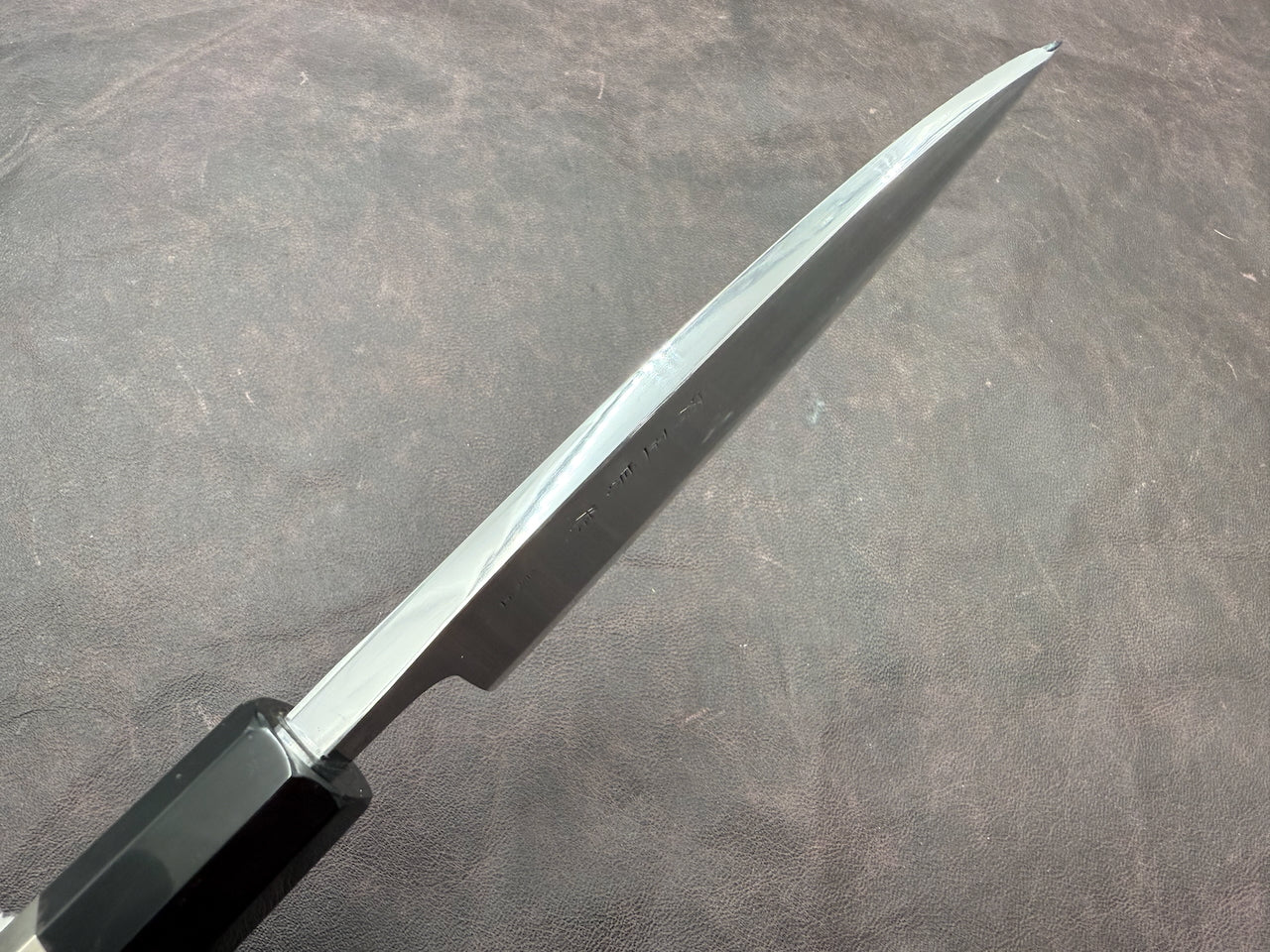 This beautifully restored Deba is in pristine condition and has many years of life remaining. It has been fully reground, polished and shows a lovely kasumi finish on the bevel and has been sharpened, fully ready for use. This Deba is perfect for medium to small fish butchery and poultry butchery. The steel is very easy to sharpen and is likely Shirogami #2 ((Also known as White Paper Steel #2, a high-carbon Japanese steel made by Hitachi Metals, prized in traditional Japanese knife-making for its extreme sharpness and ease of sharpening). The new custom handle is octagonal ebony with metal spacer and black buffalo horn ferrule. The knife has a 150mm cutting edge and 305mm overall length.