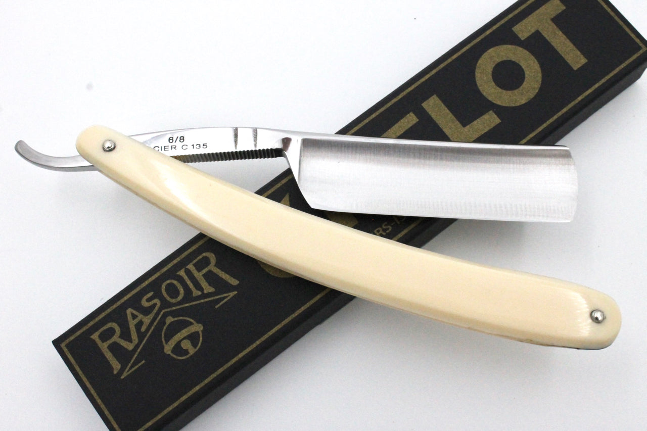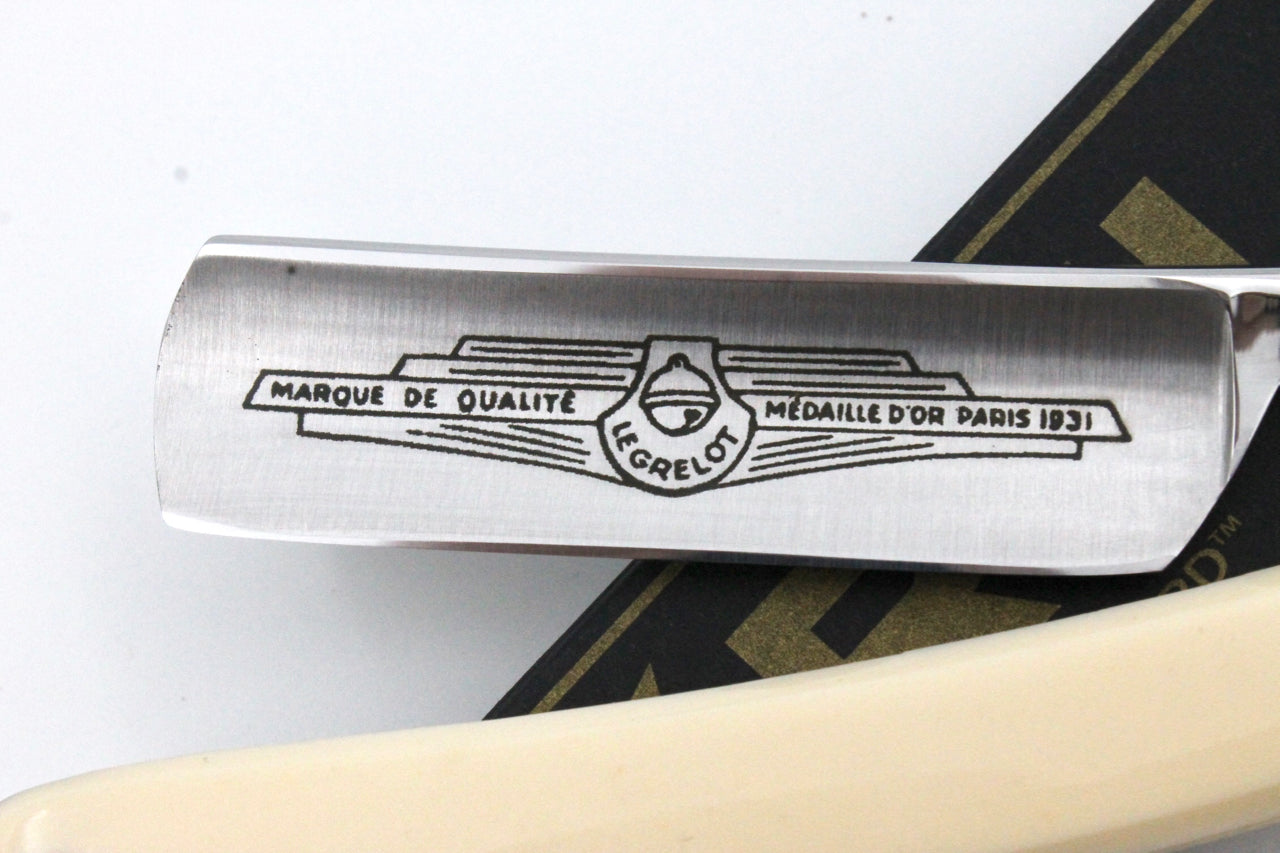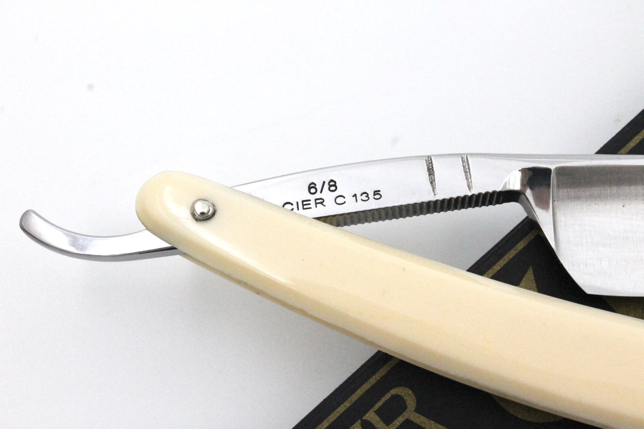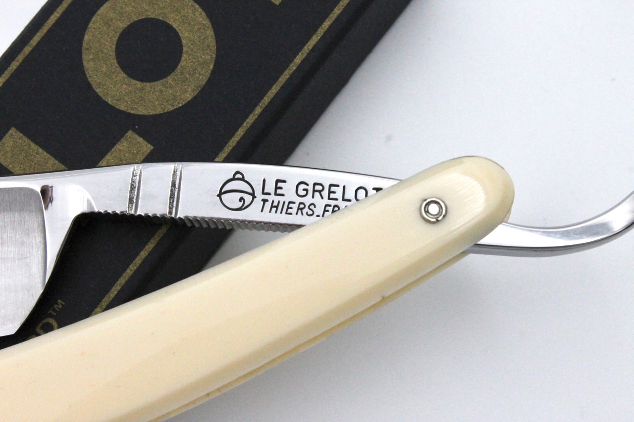 Dieses 6/8-Rasiermesser der Marke „Le Grelot“ von Thiers Issued verfügt über eine vollständig hohlgeschliffene Klinge aus Carbonsong-Stahl c135 mit detaillierter Ätzung, satinierten Klingenflächen mit hochglanzpoliertem Rücken und Erl, runder Spitze und Riffelung im unteren Bereich. Die Rasierergriffschalen sind aus hochwertigem und langlebigem weißem Harz mit Hochglanz gefertigt. Jedes Rasiermesser wird in einer Vintage-inspirierten Pappschachtel geliefert.