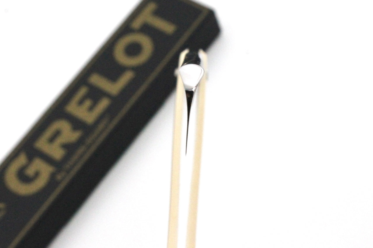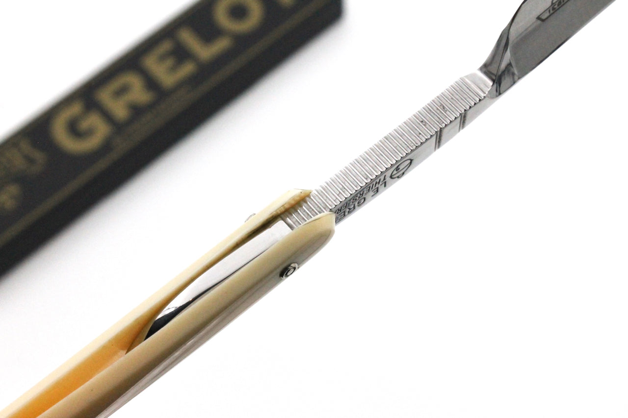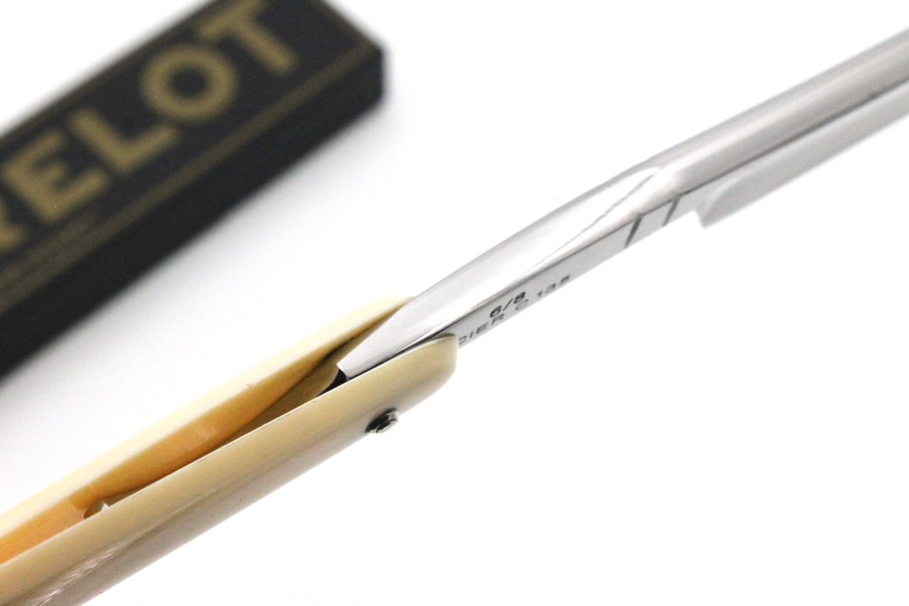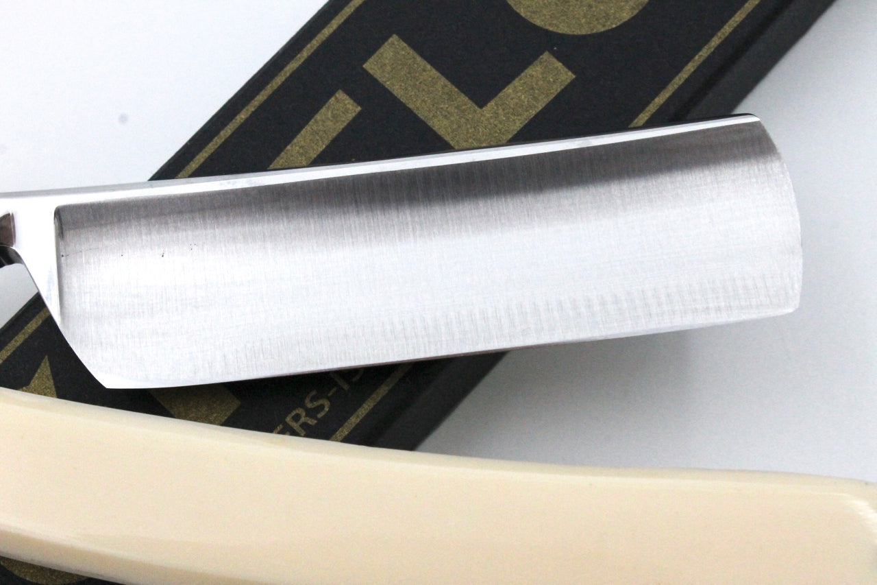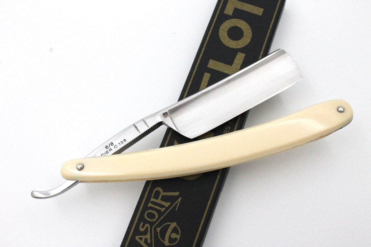 Dieses 6/8-Rasiermesser der Marke „Le Grelot“ von Thiers Issued verfügt über eine vollständig hohlgeschliffene Klinge aus Carbonsong-Stahl c135 mit detaillierter Ätzung, satinierten Klingenflächen mit hochglanzpoliertem Rücken und Erl, runder Spitze und Riffelung im unteren Bereich. Die Rasierergriffschalen sind aus hochwertigem und langlebigem weißem Harz mit Hochglanz gefertigt. Jedes Rasiermesser wird in einer Vintage-inspirierten Pappschachtel geliefert.