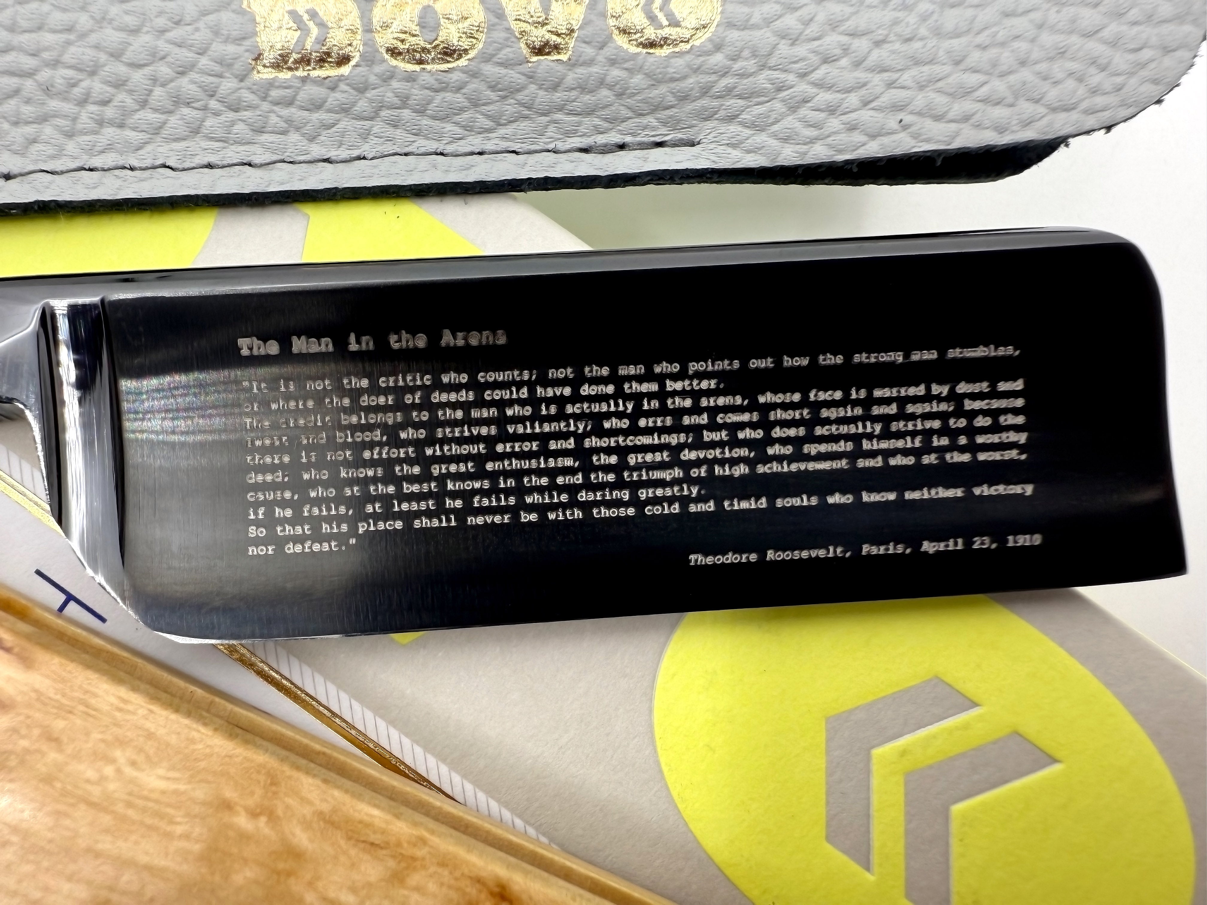 C'est ce courage que représente cette lame. Elle s'inspire du discours de Theodore Roosevelt intitulé « La citoyenneté dans une république ». Un extrait de ce discours, connu sous le nom de « L'homme dans l'arène », est gravé en entier au dos de cette lame spéciale.