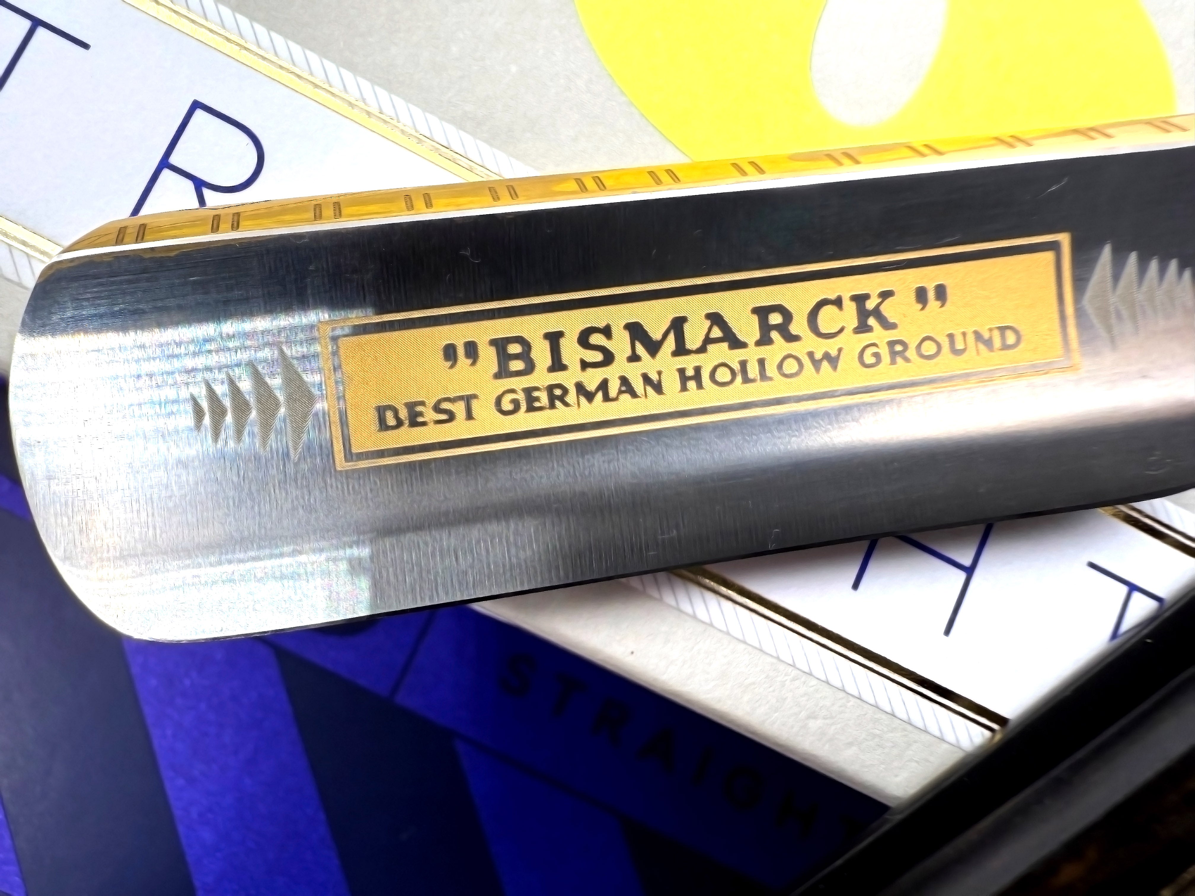 Le "Bismarck" est un rasoir 6/8 entièrement creux avec un magnifique dos gravé et doré, une gravure bicolore détaillée et une pointe ronde. Les écailles du rasoir sont fabriquées en bois d'ébène attrayant et de haute qualité avec une décoration dorée
