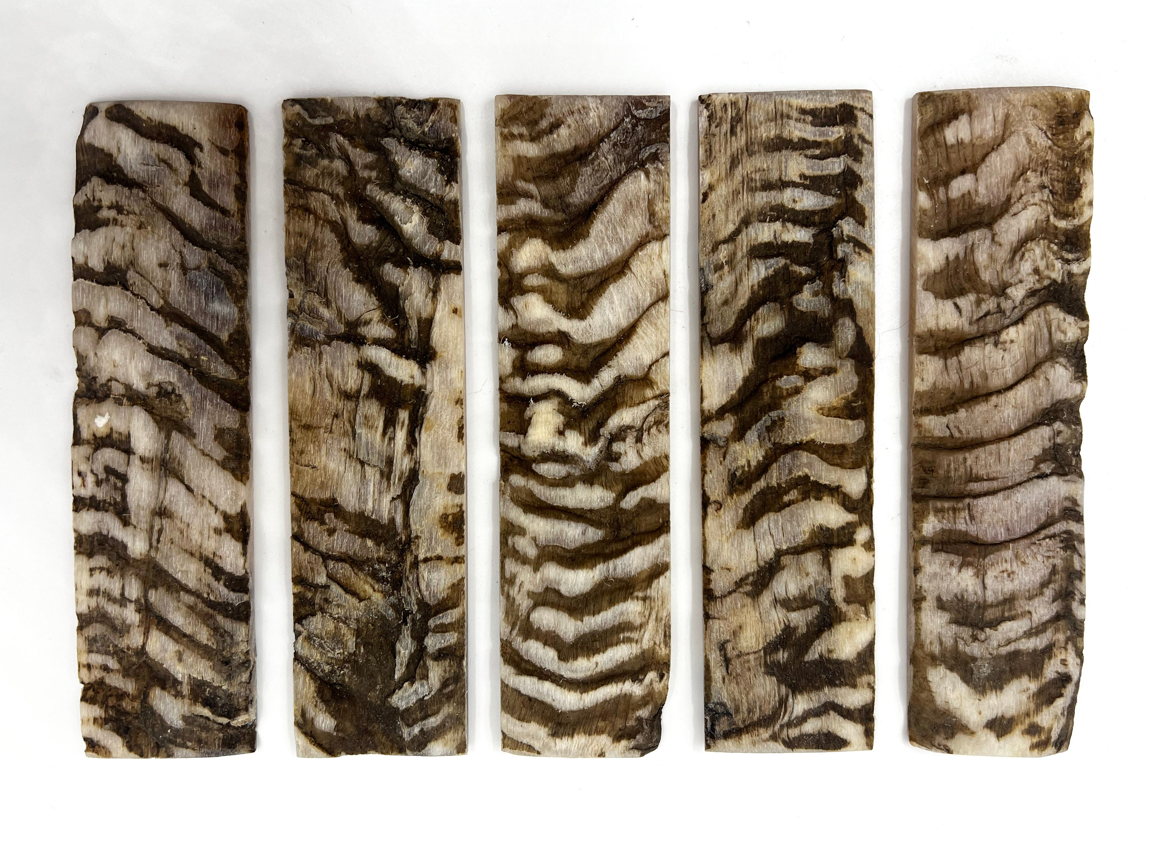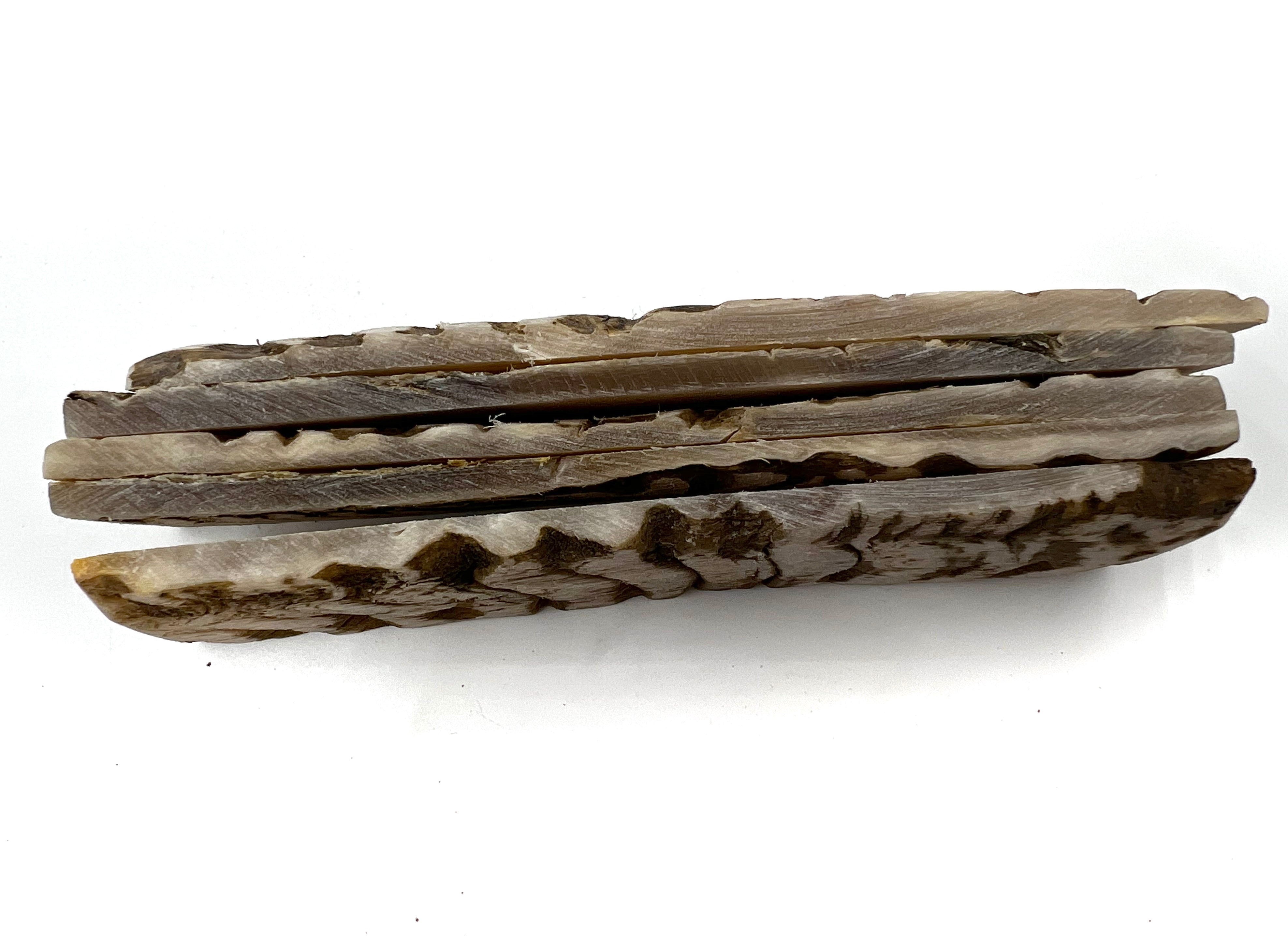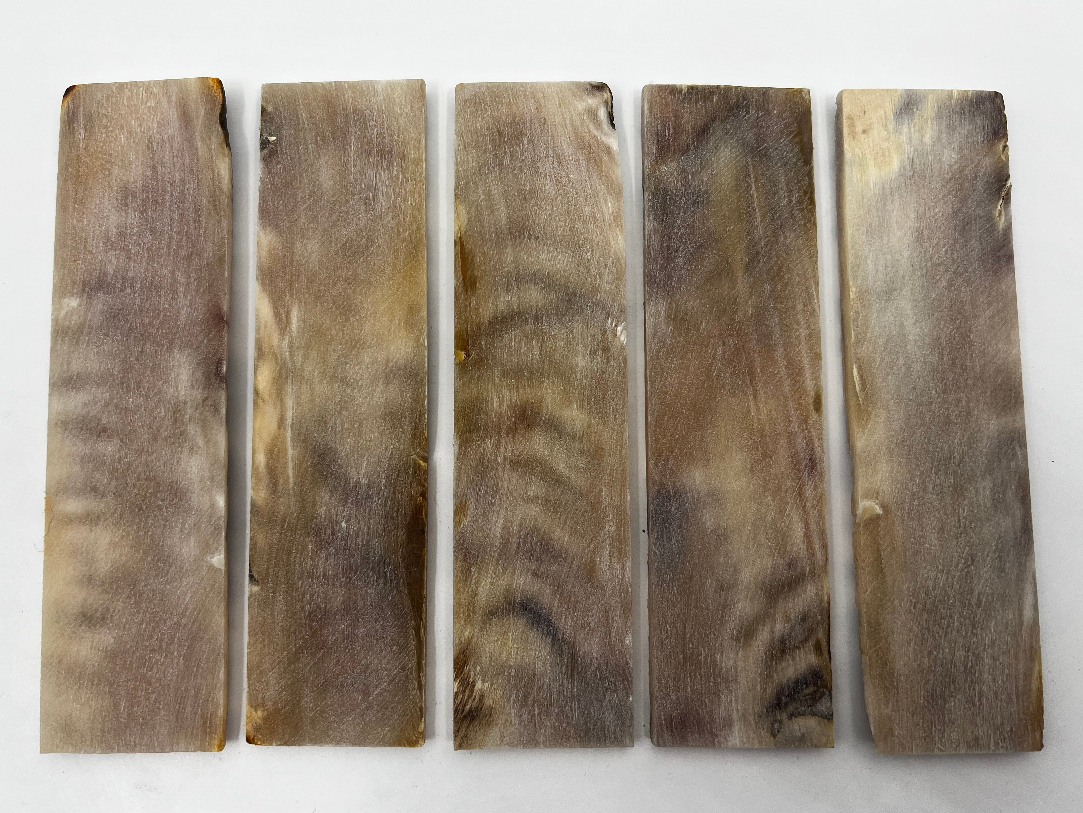 Ces plaques en corne de bélier très travaillées et difficiles à trouver dans cette taille sont fabriquées selon nos spécifications en Inde par un fabricant de haute qualité. L'une est suffisamment grande pour fabriquer un jeu d'écailles pour les lames plus petites (3/8-6/8) tandis que les lames plus grandes (7/8-8/8 et plus) en nécessiteront deux. Mesurant environ 4 mm d'épaisseur, elles sont grossièrement poncées des deux côtés.