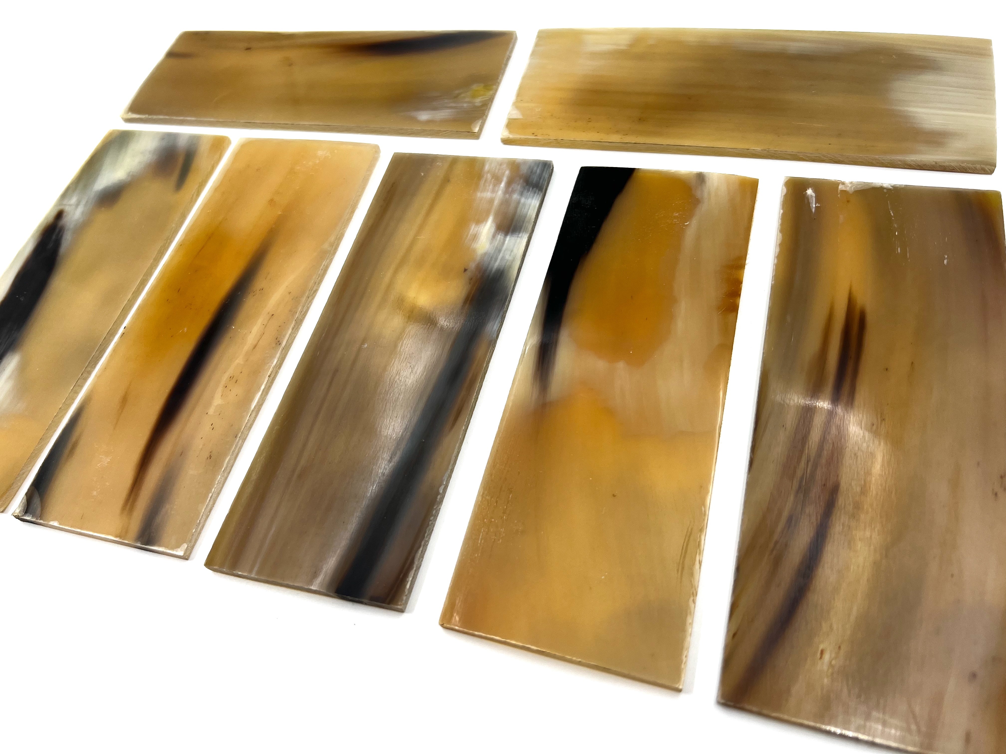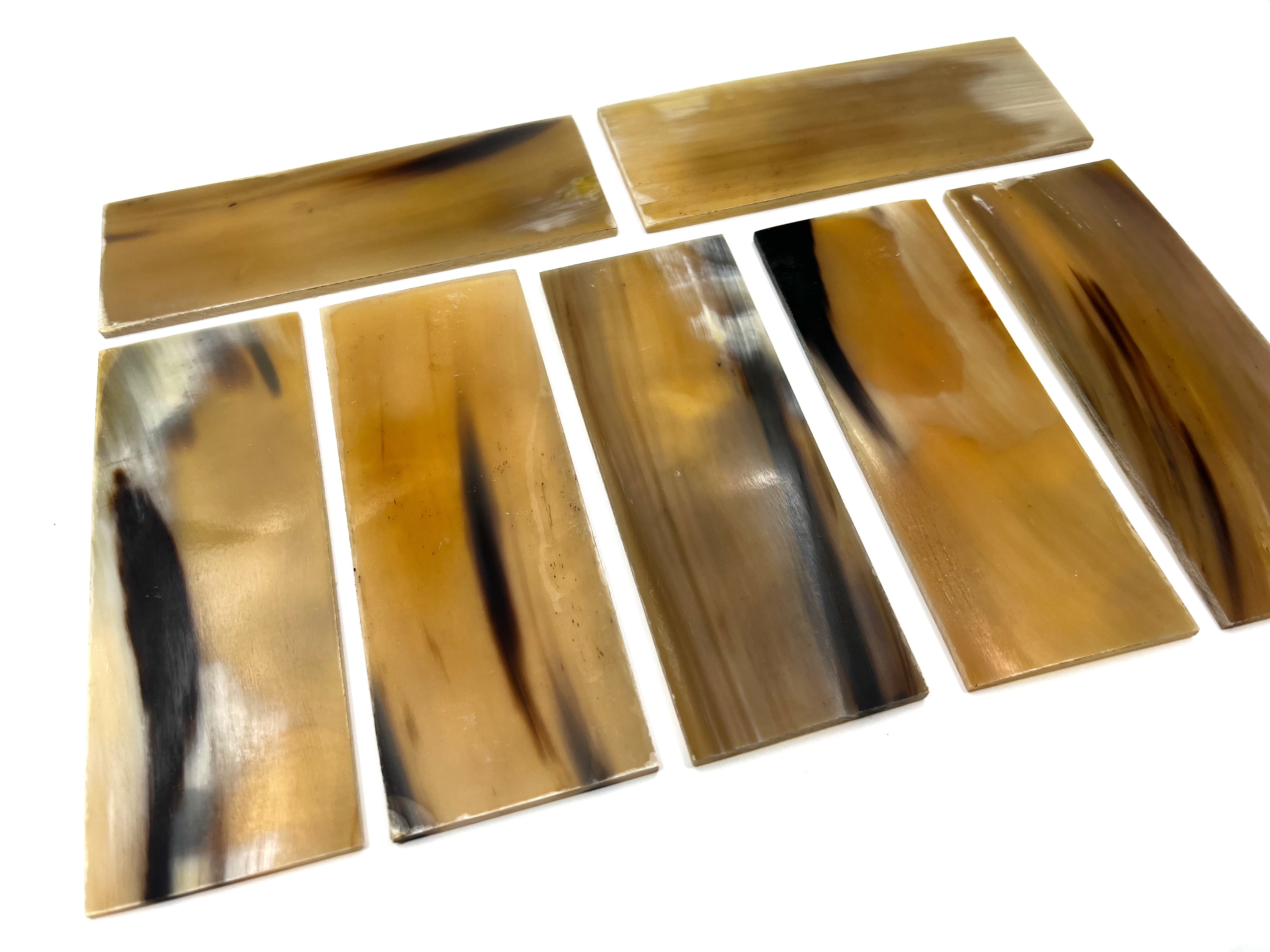 Ces plaques de corne sont fabriquées selon nos spécifications en Inde par un fabricant de haute qualité. Une plaque est suffisamment grande pour fabriquer un jeu d'écailles même pour les grands rasoirs (7/8-8/8 et plus). Mesurant environ 3 à 4 mm d'épaisseur, elles sont polies d'un côté et grossièrement poncées de l'autre.