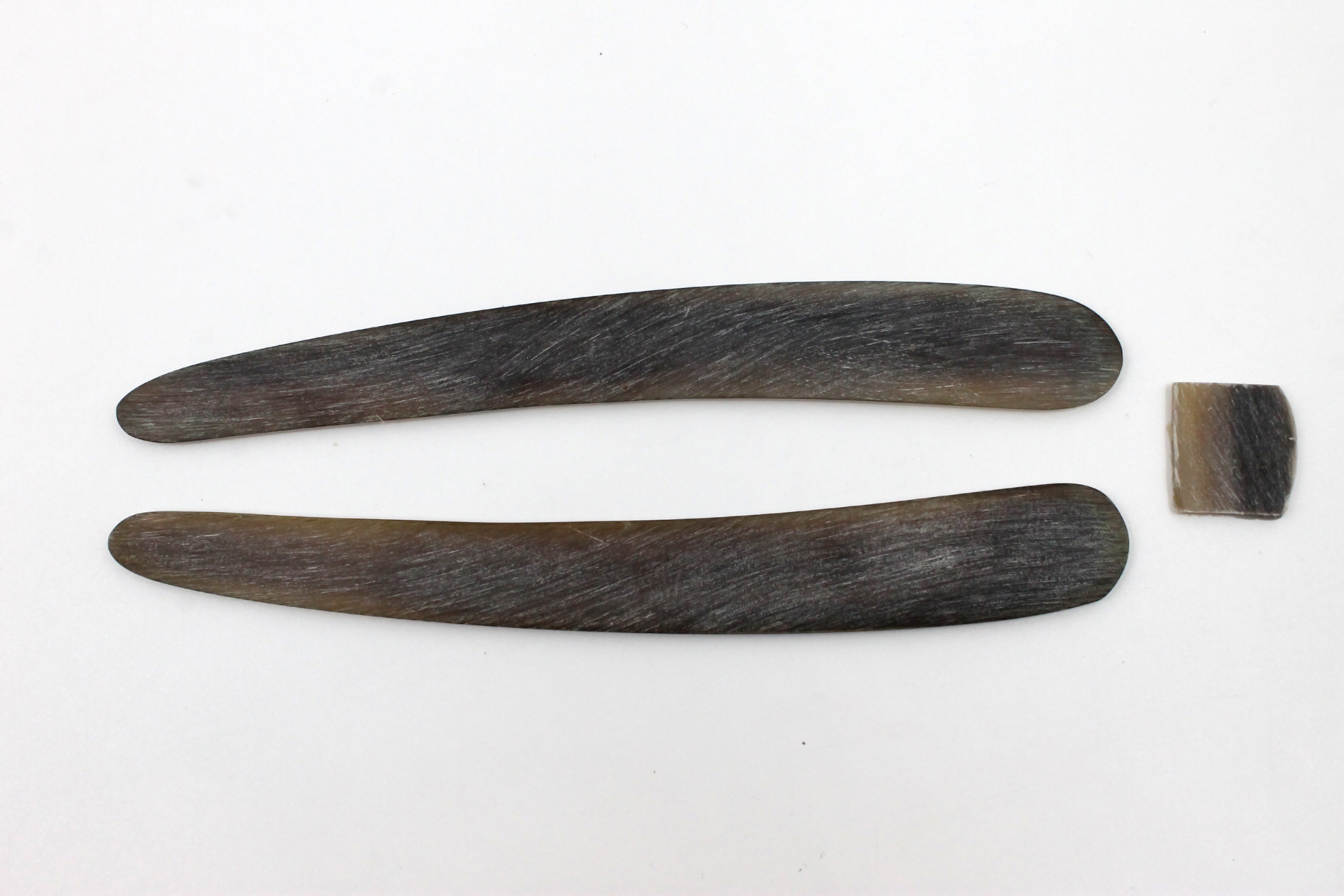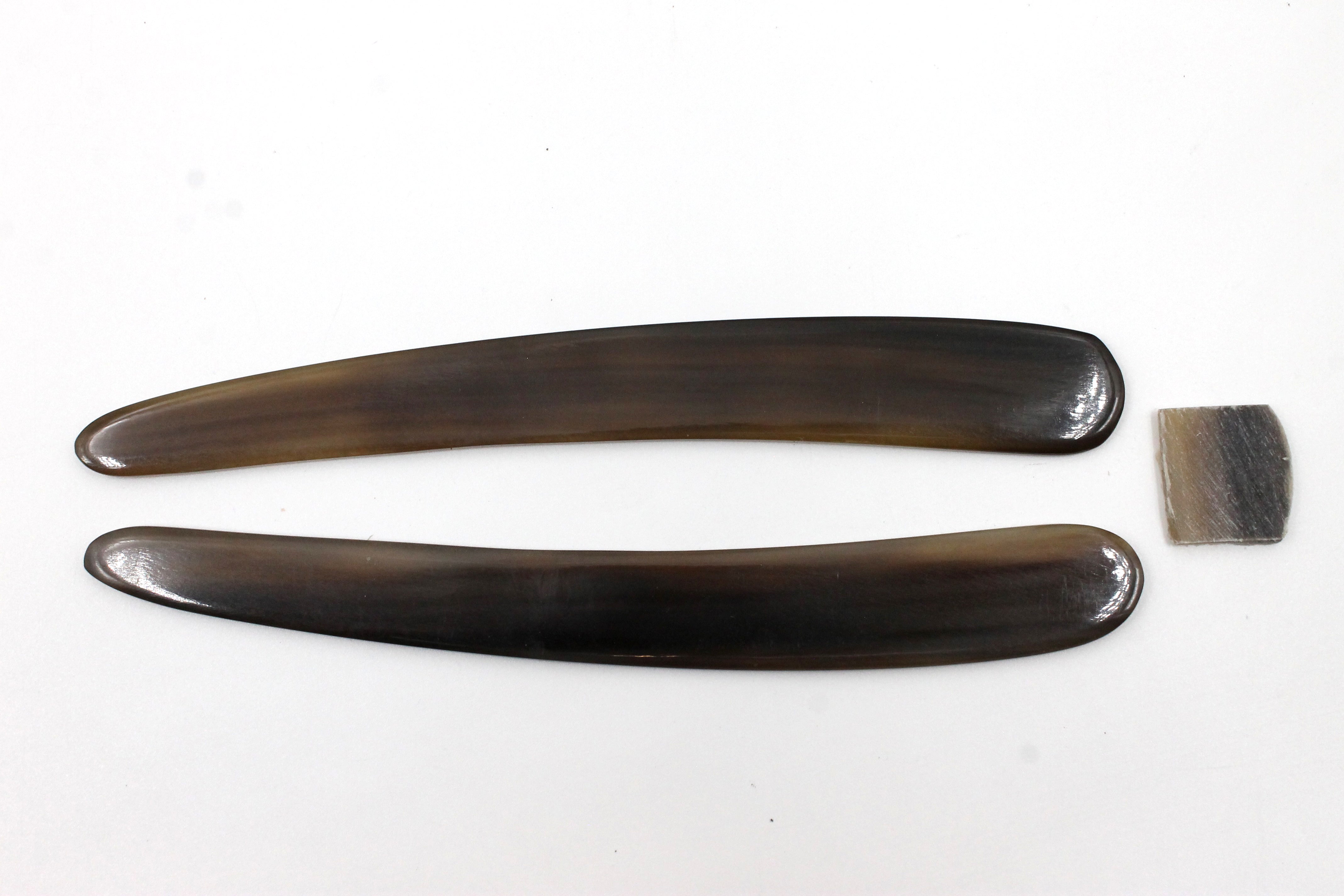 Ces écailles de rasoir sont fabriquées selon nos spécifications en Inde par un fabricant de haute qualité. Elles sont dimensionnées spécifiquement pour les lames 5/8-6/8 et éventuellement plus petites ou plus grandes selon la forme de la lame. Mesurant environ 3 mm d'épaisseur, elles ne sont pas trop lourdes et bien finies. Une cale d'espacement en corne noire est incluse et peut être poncée pour corriger la forme et l'épaisseur de la cale en fonction de votre lame. Les surfaces intérieures des écailles sont grossièrement poncées et peuvent être laissées telles quelles ou poncées et polies davantage si vous le souhaitez. Le modèle de ces écailles est illustré, bien que la forme varie légèrement car elles sont fabriquées à la main.