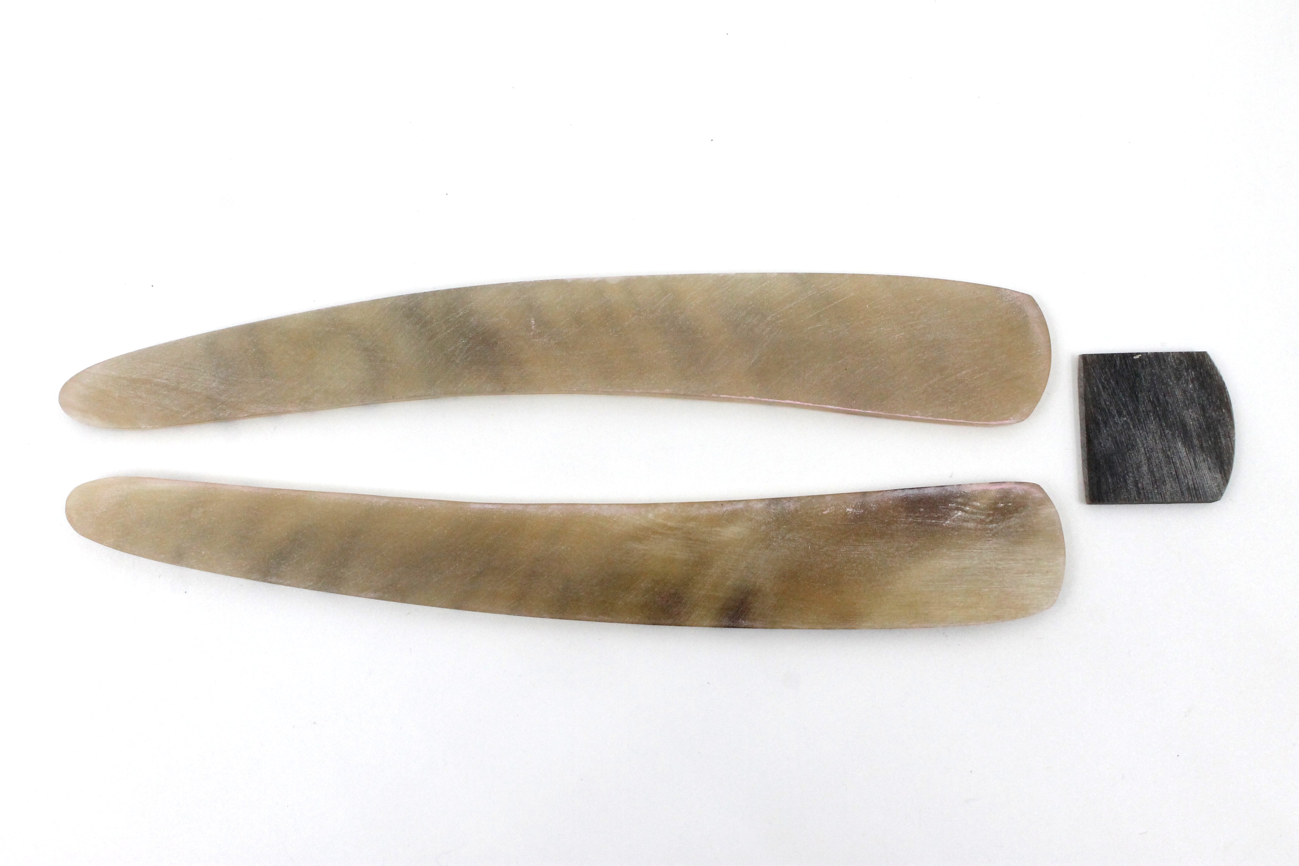 Ces écailles de rasoir sont fabriquées selon nos spécifications en Inde par un fabricant de haute qualité. Elles sont dimensionnées spécifiquement pour les lames 7 /8- 8/8 et éventuellement plus petites ou plus grandes selon la forme de la lame. Mesurant environ 3 mm d'épaisseur, elles ne sont pas trop lourdes et bien finies. Une cale d'espacement en corne noire est incluse et peut être poncée pour corriger la forme et l'épaisseur de la cale en fonction de votre lame. Les surfaces intérieures des écailles sont grossièrement poncées et peuvent être laissées telles quelles ou poncées et polies davantage si vous le souhaitez. Le modèle de ces écailles est illustré, bien que la forme varie légèrement car elles sont fabriquées à la main.