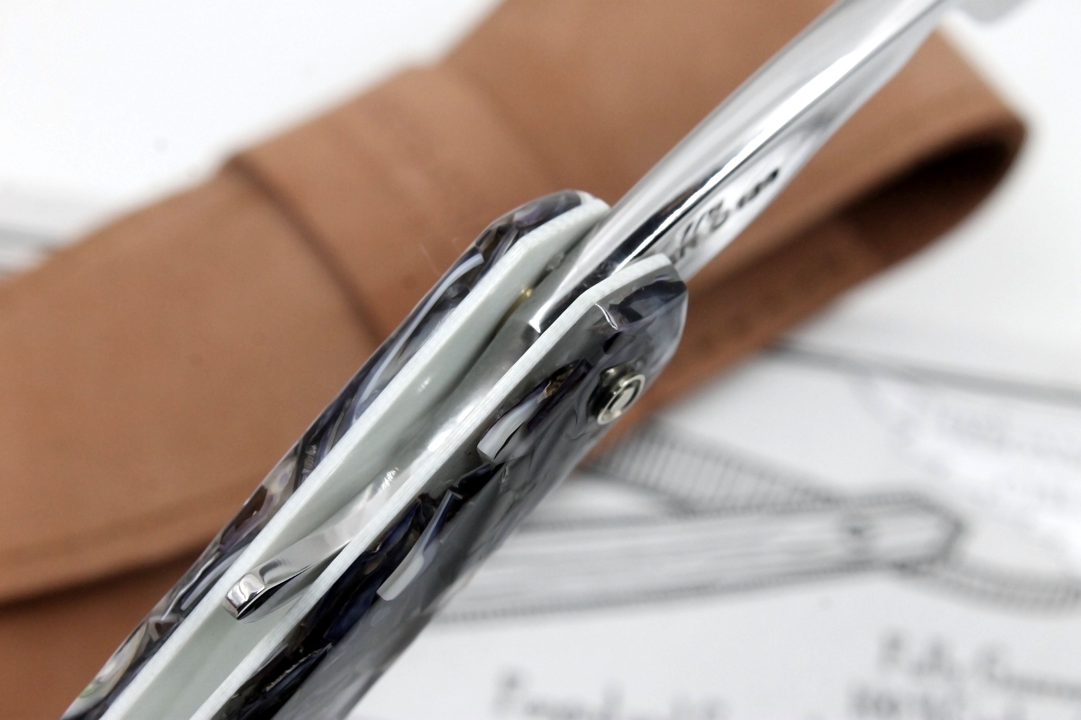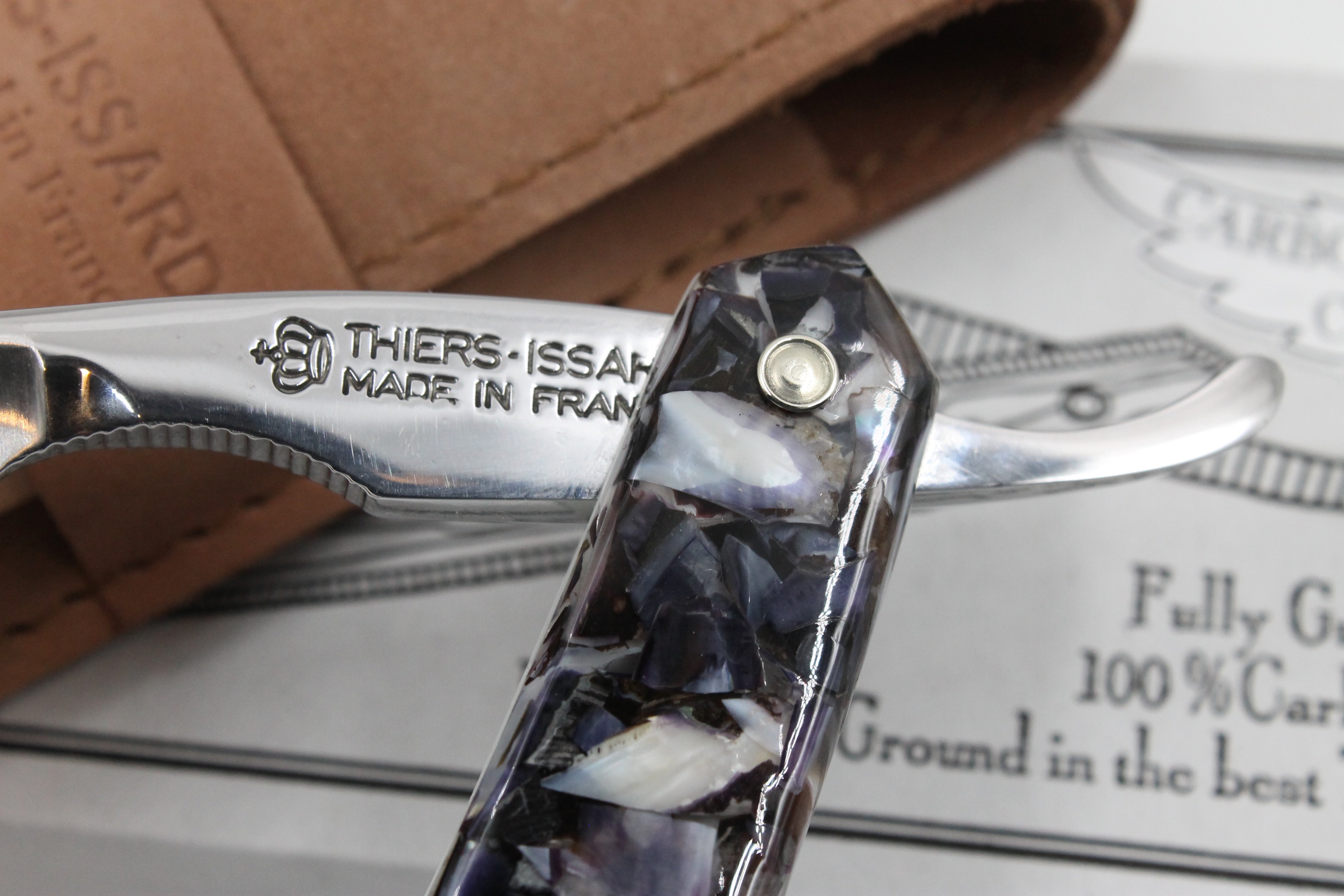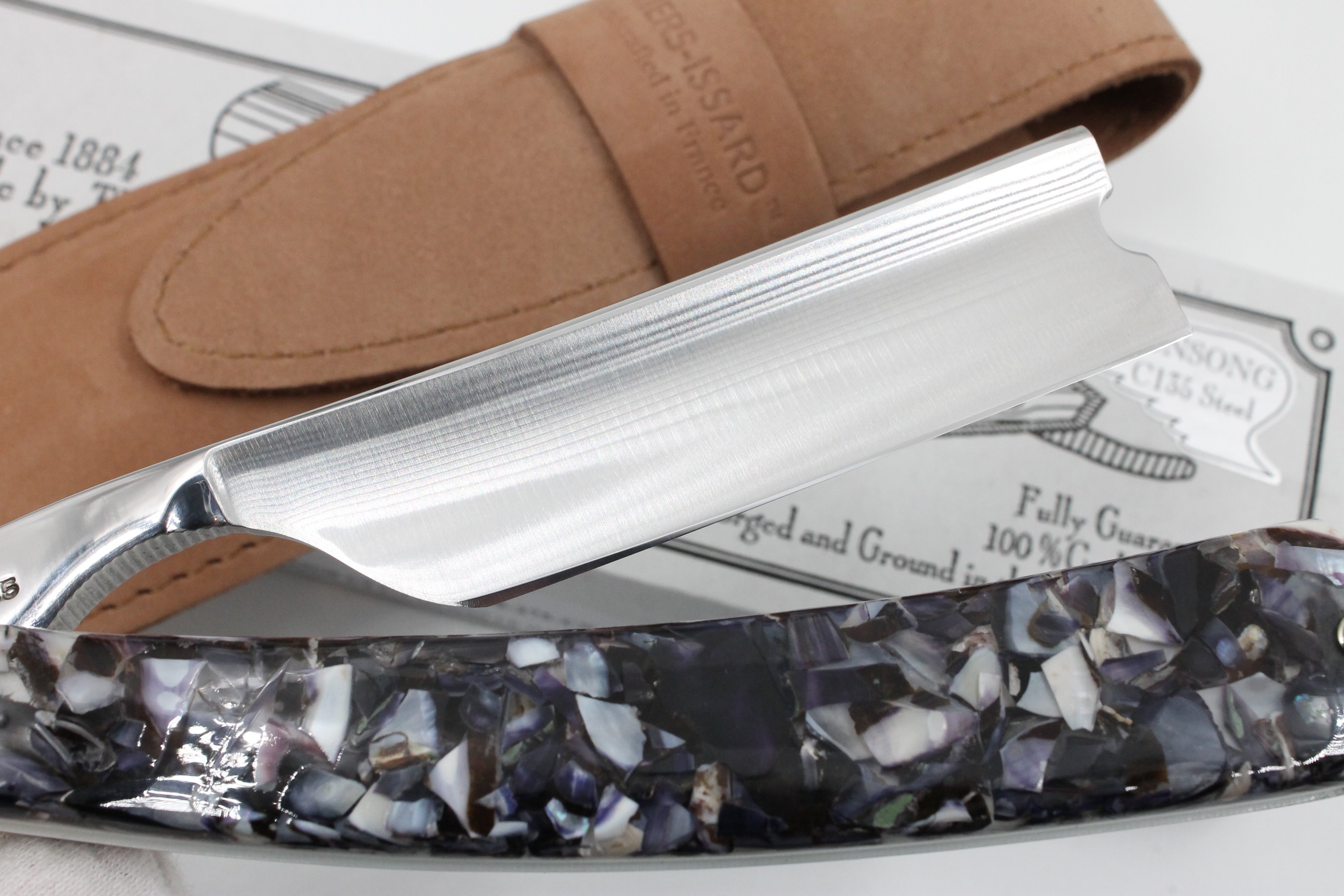 Cet impressionnant rasoir 7/8 est doté d'une lame entièrement creuse en acier Carbonsong 135 avec un polissage miroir complet, une gravure détaillée bicolore dorée, un nez crochu et une bordure inférieure. Les écailles du rasoir sont fabriquées à partir d'un matériau composite avec de nombreux morceaux de coquilles de moules véritables intégrés. Chaque rasoir Thiers Issard comprend un étui de rangement en cuir souple de haute qualité, comme illustré.