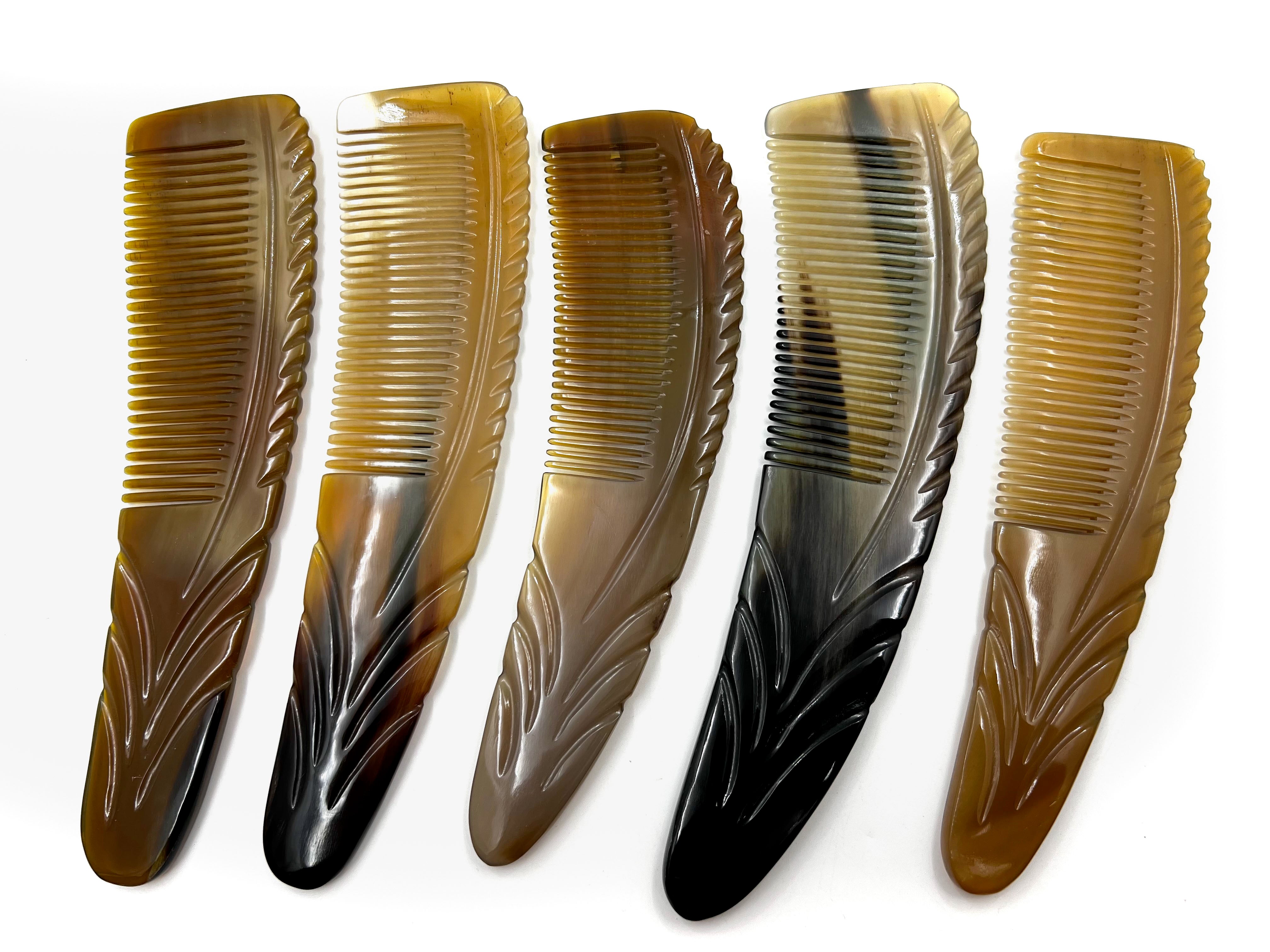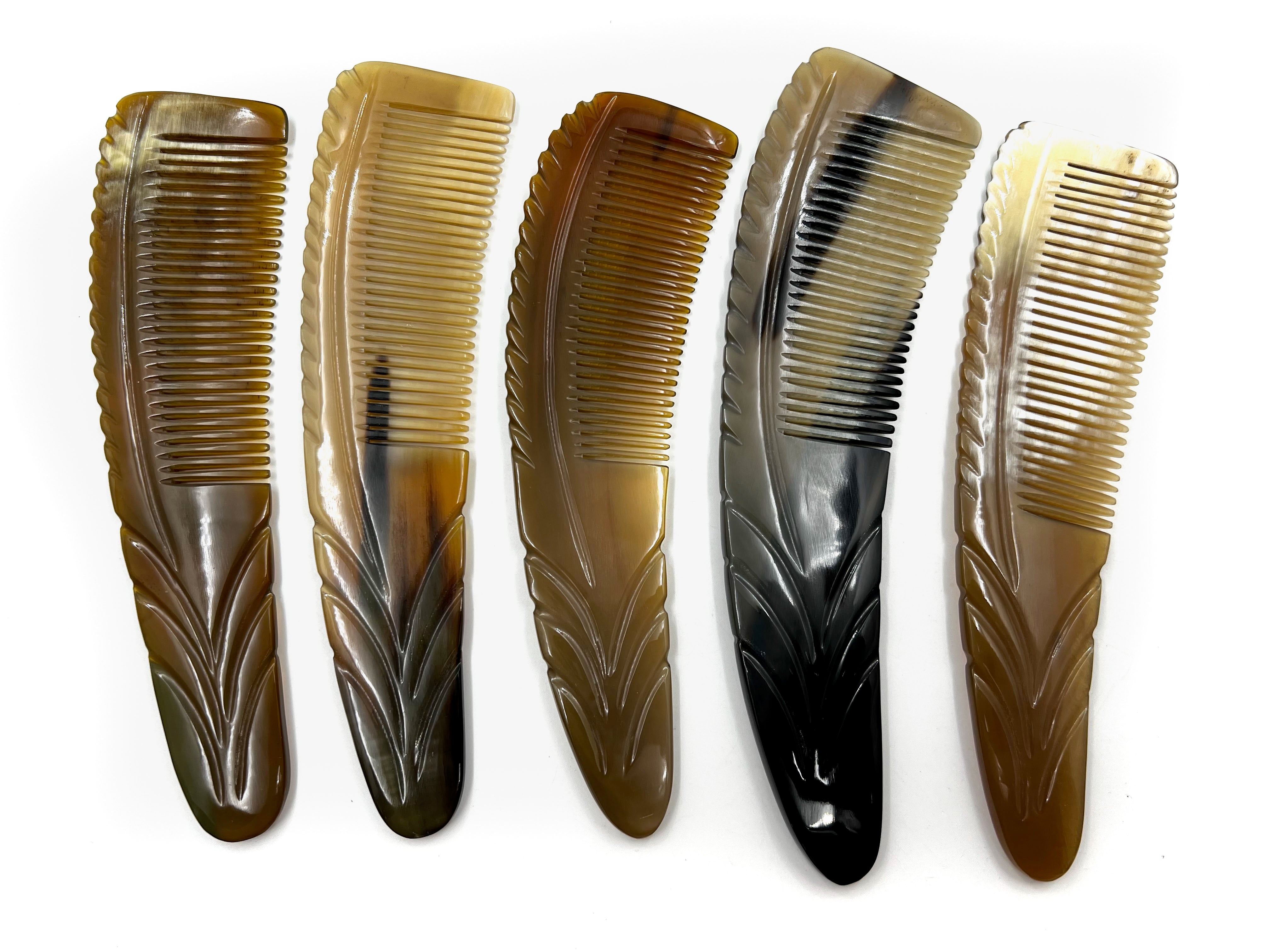 Ces peignes en corne naturelle sculptés à la main et très travaillés sont magnifiques à voir et fonctionnent à merveille pour trier les nœuds, répartir les huiles capillaires et vous garder au meilleur de votre forme. Contrairement aux peignes en plastique, ils sont naturellement antistatiques et parfaits pour la tête, la barbe ou n'importe où.