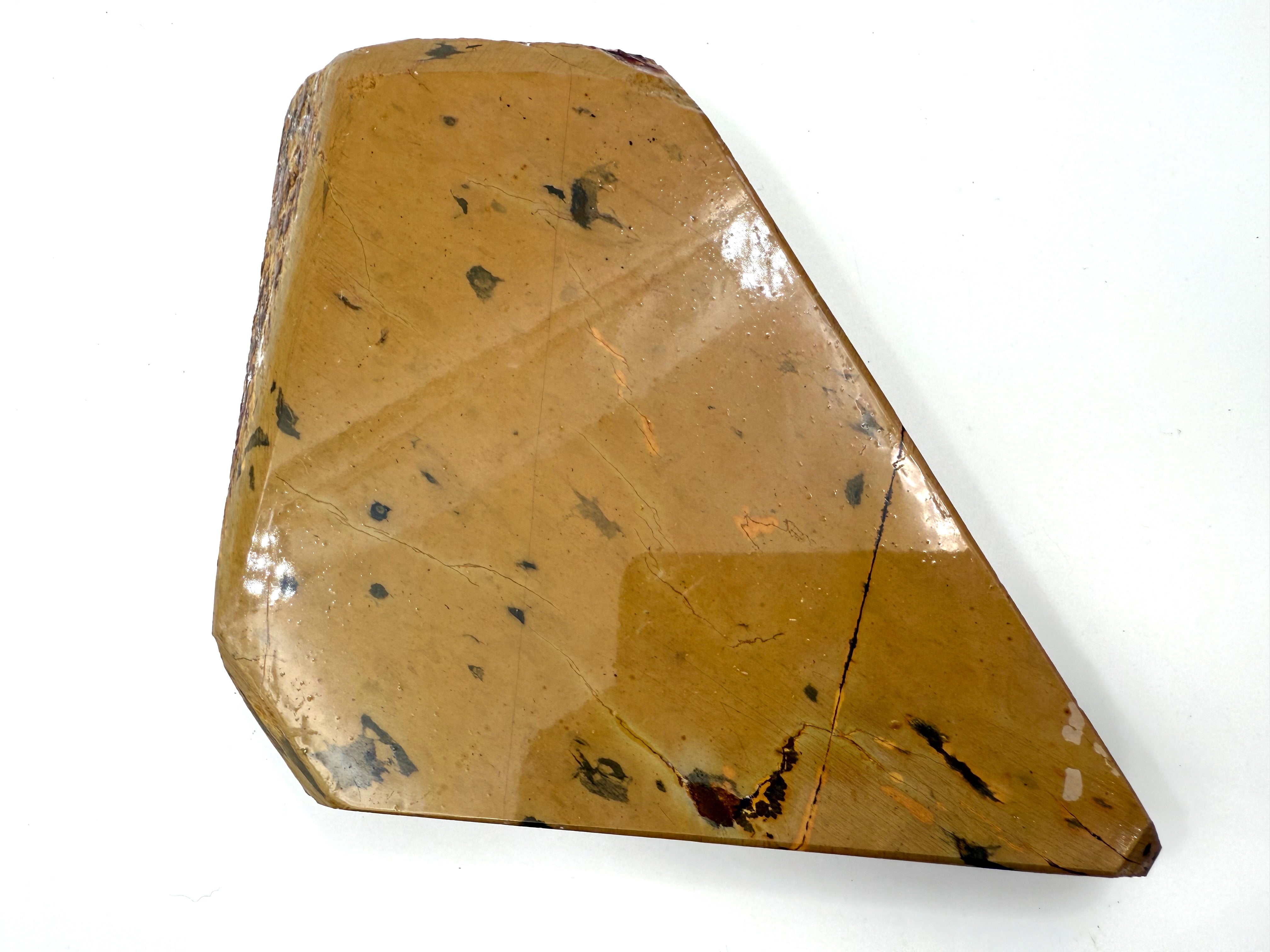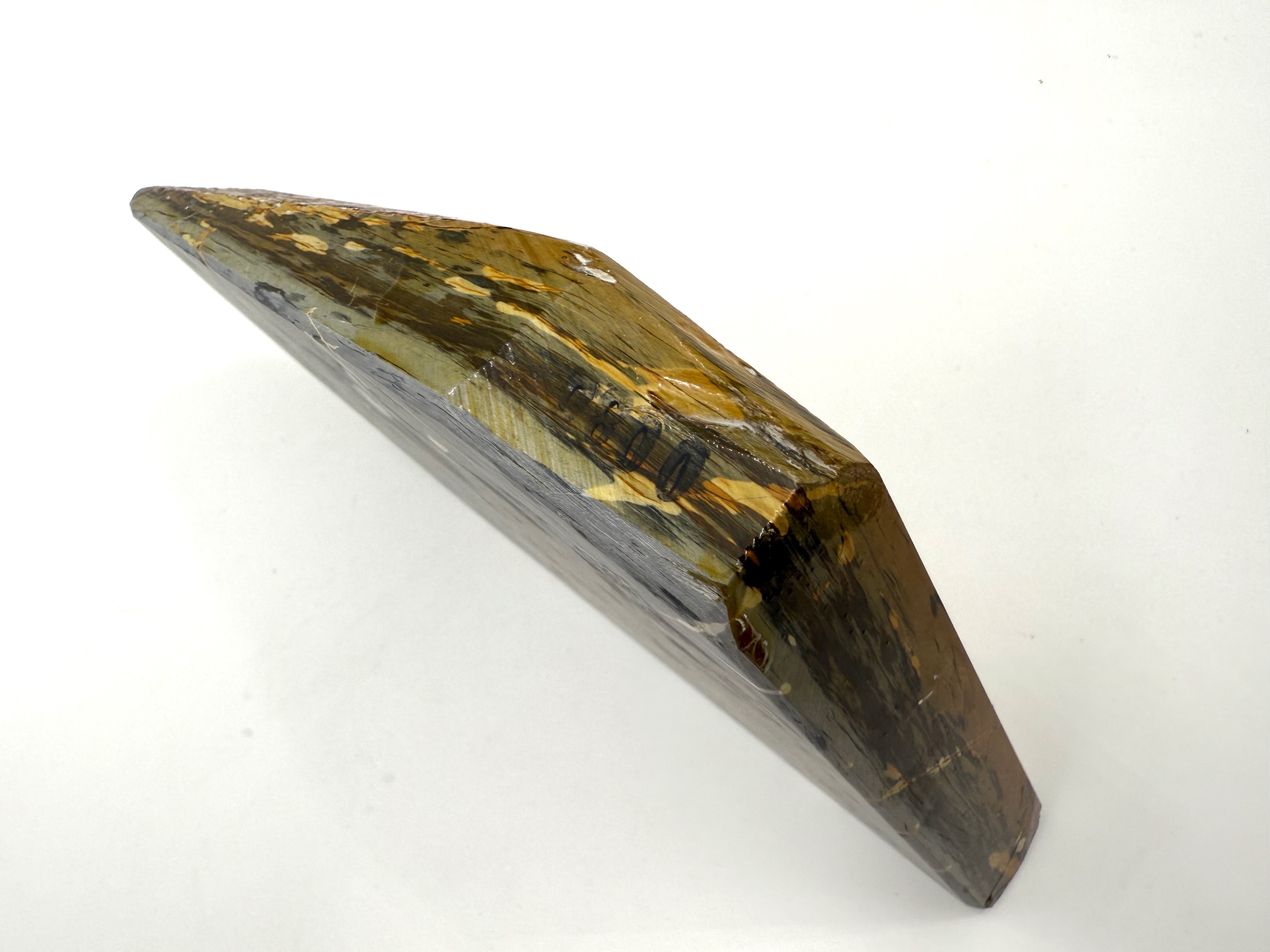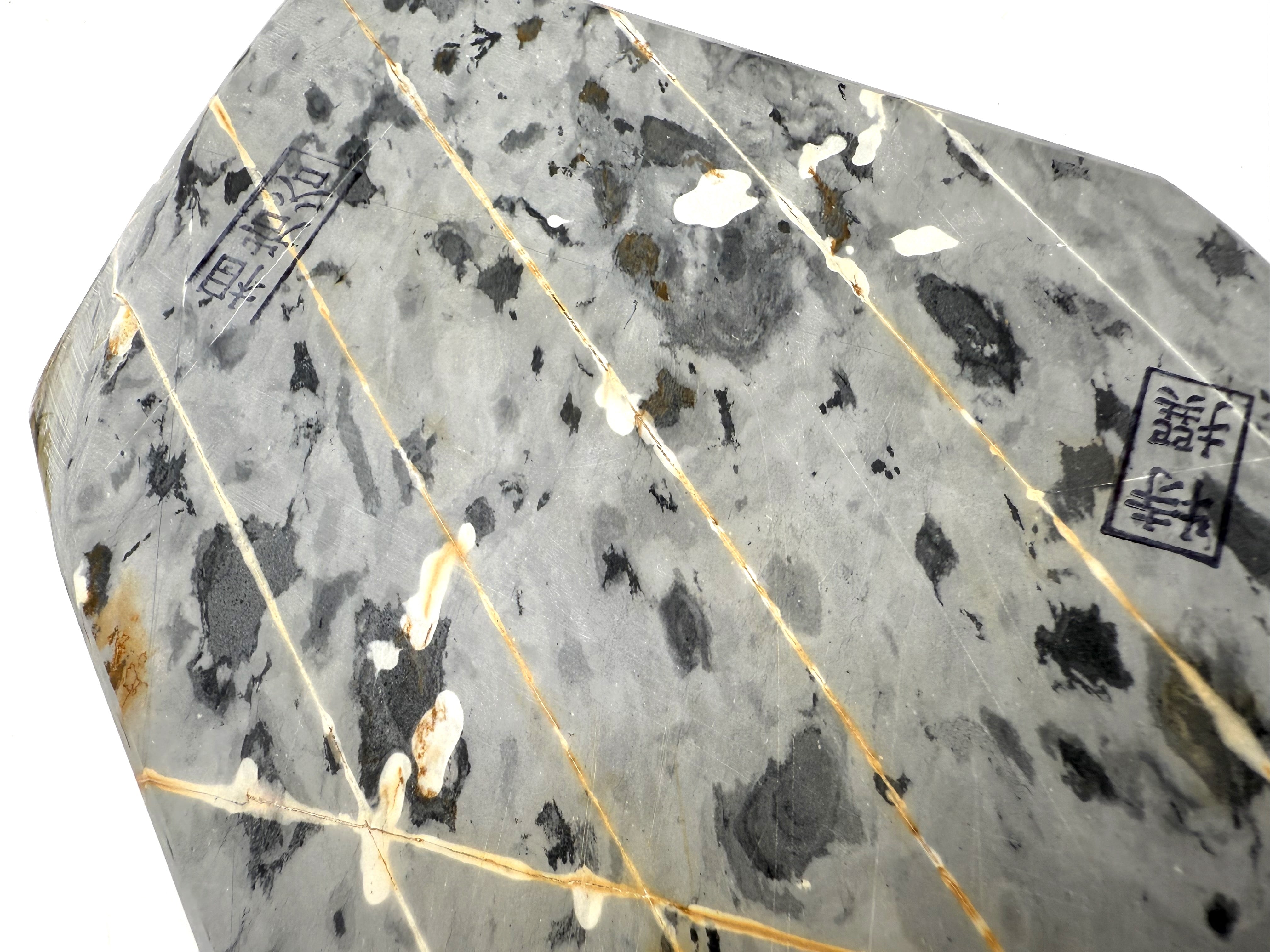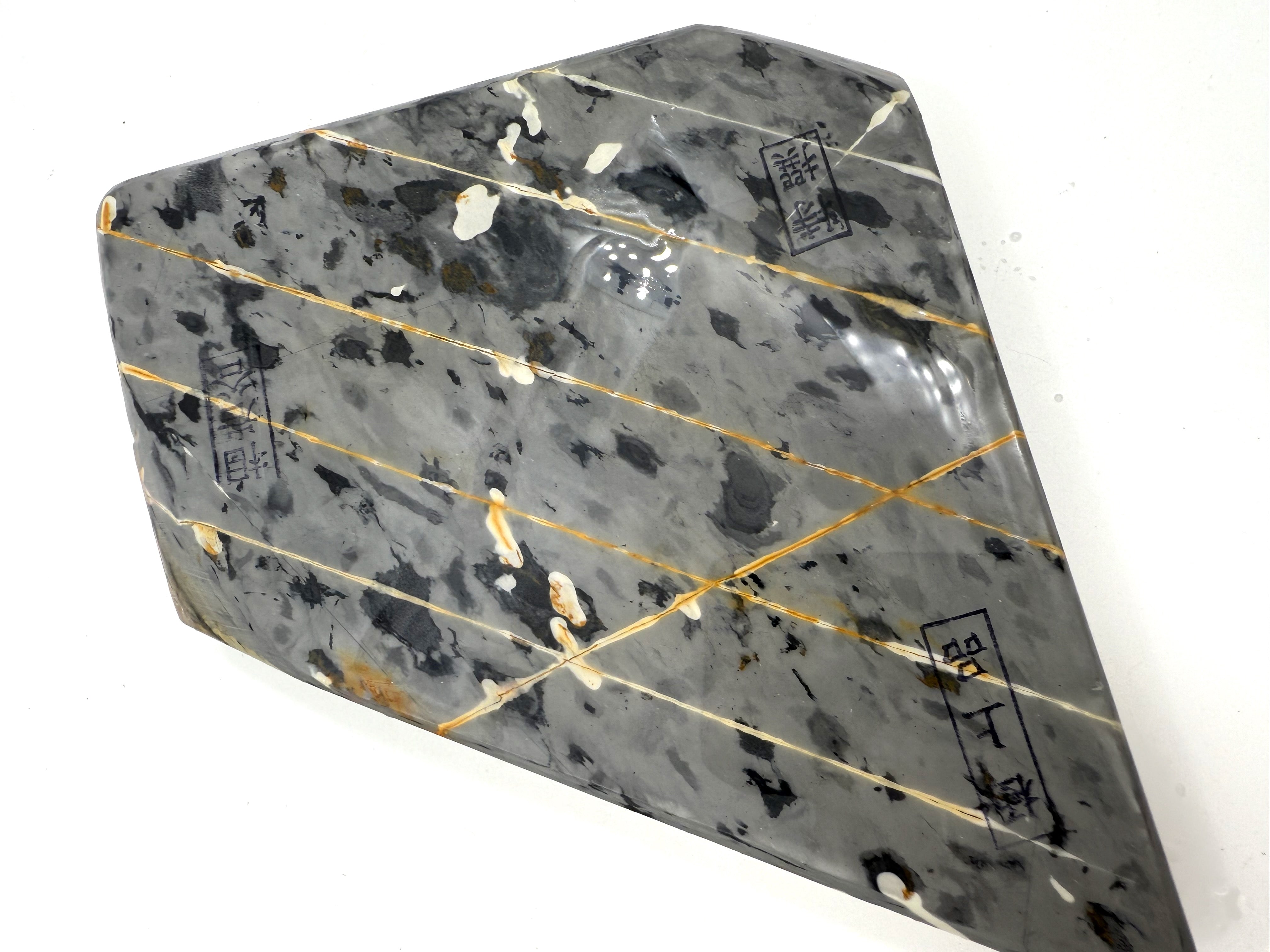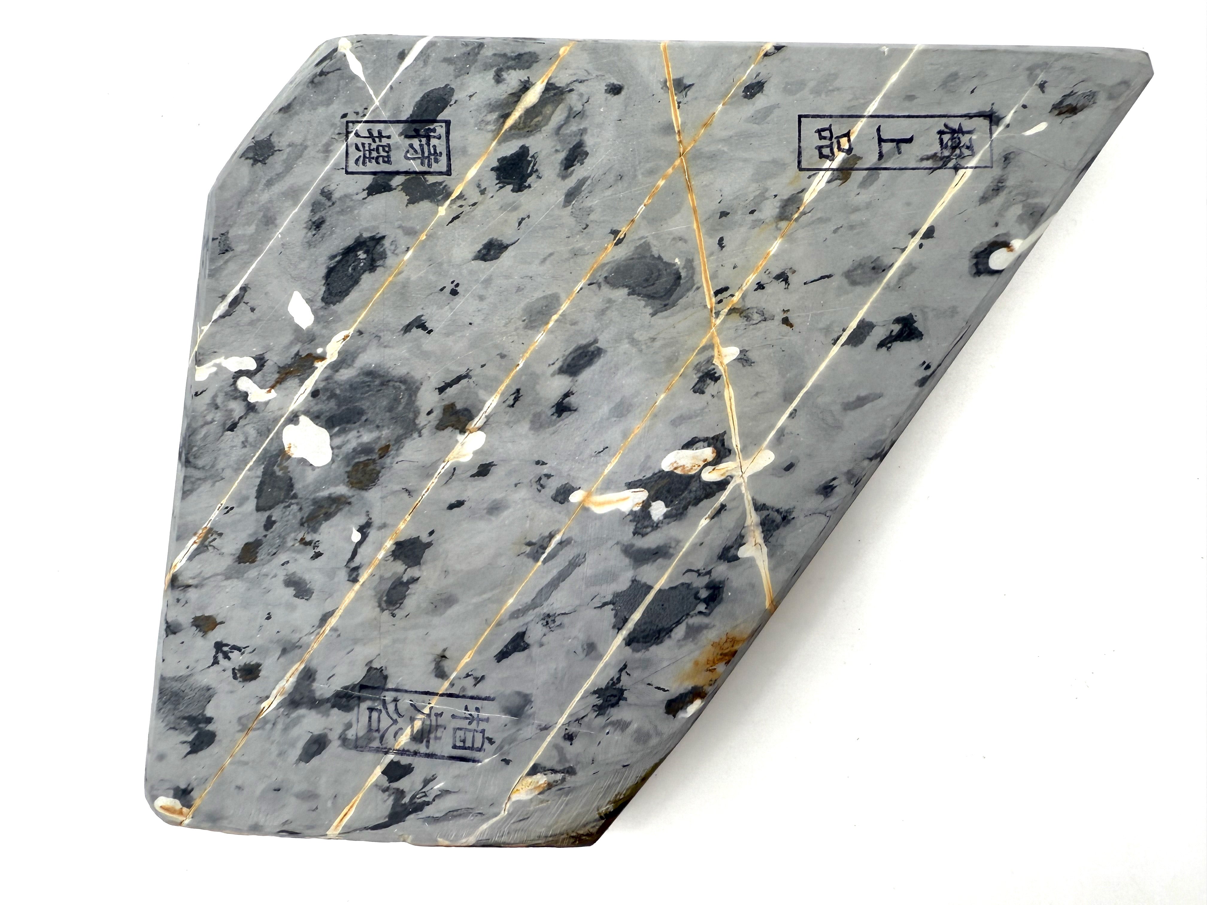 A large, firm, Karasu koppa from Aiiwatani containing Suita and Aisa. This stone is best suited for finishing of razors and finishing cutlery. This stone has geometric Namazu which run in a near perfect grid-like pattern. We tested these using firm pressure with blades of varying weight and material composition and had no negative effects such as scratching, release of toxic particles, or distracting tactile feel. However, judging by the appearance of 2 which intersect and contain orange color, it is of our opinion that the probability of them becoming an issue is around 50% therefore we priced it at a discounted rate. If they ever become bothersome, they can be easily removed and maintained with no negative affects. This stone is quite hard and fine making it great for finishing razors. It's strong abrasive power and slight elasticity make it great for standalone finishing. Not the best for Mikawa Nagura progressions as the nagura feedback is quiet and the stone releases it's slurry into the mix creating a wide range of grit in the mix. The stone is great for knife polishing with a great balance of slurry to swarf ratio. This makes achieving a smooth and even finish achieved with little effort. The stone is firm enough to allow for a wide range of finishes depending on how it's used. A versatile, beautiful and highly functional piece with an affordable price for its quality and size!