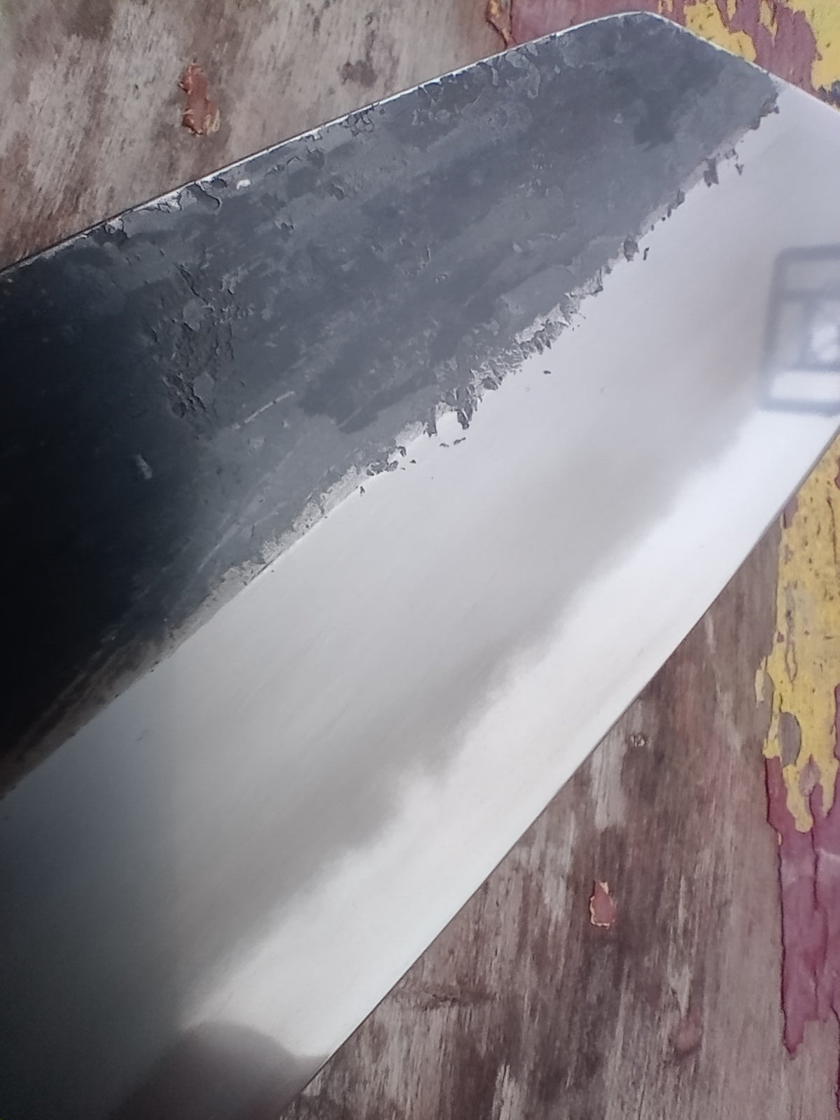 A photo of the stone's polishing ability on soft and hard steels of a Japanese kitchen knife is shown.