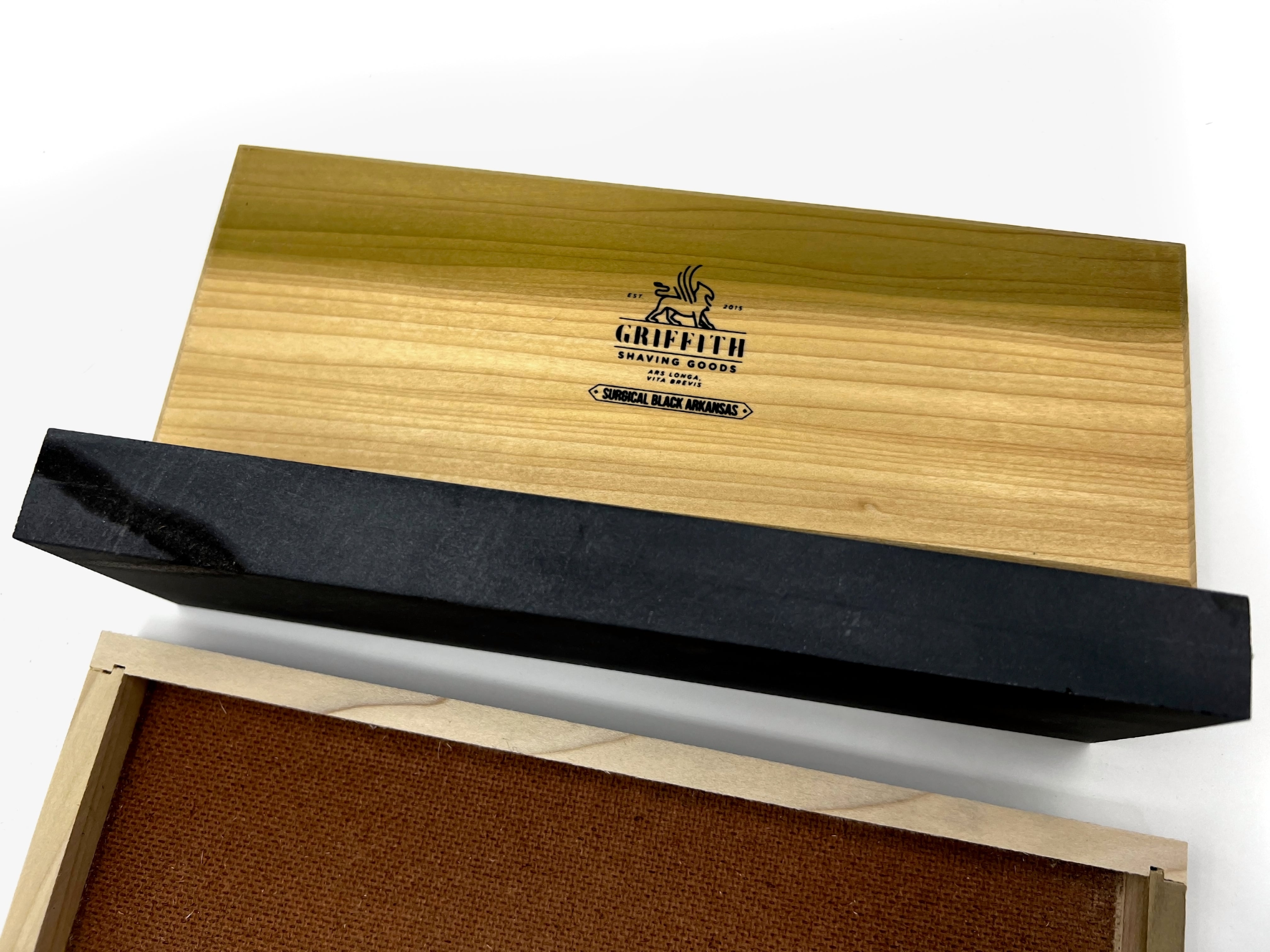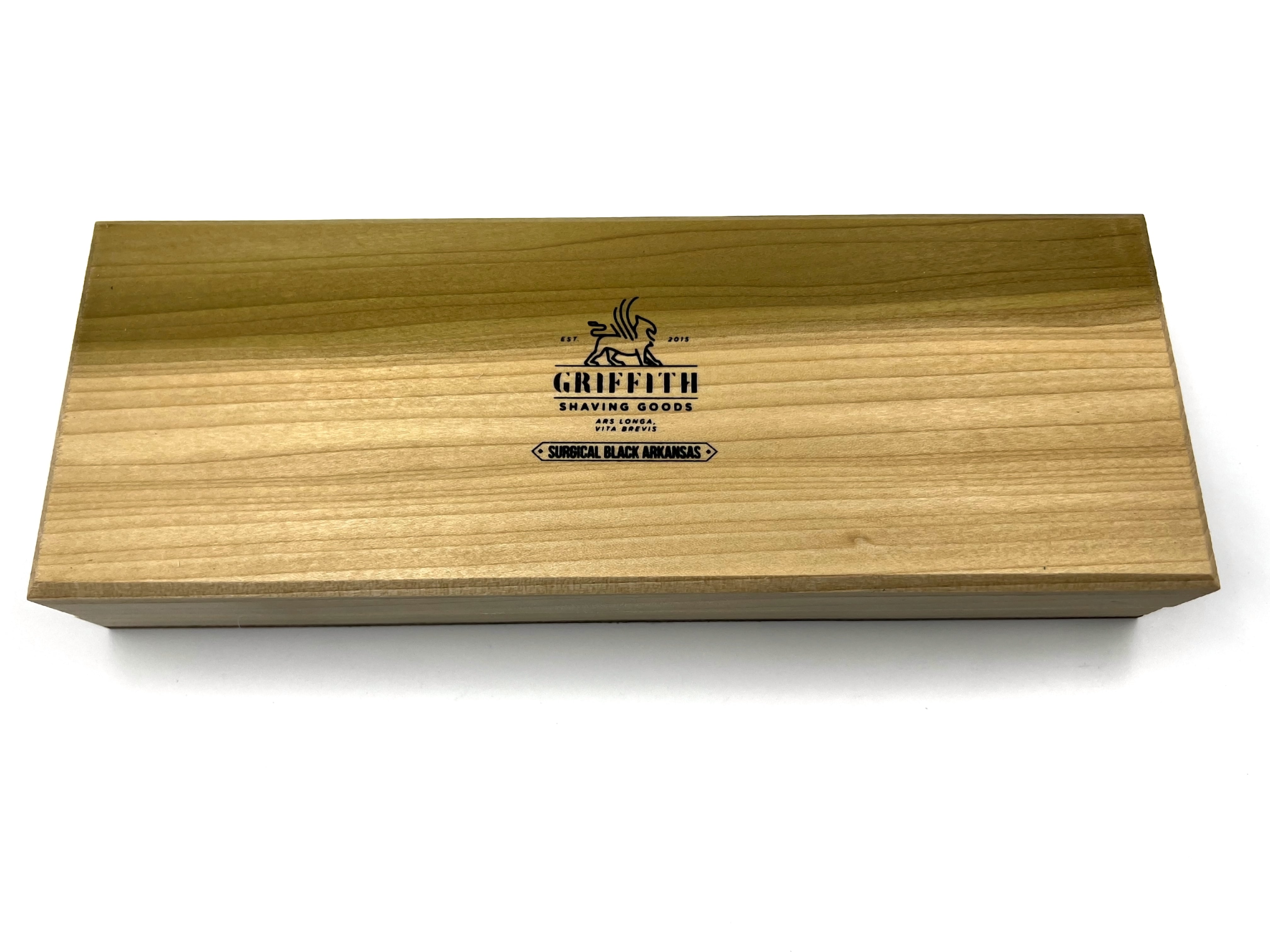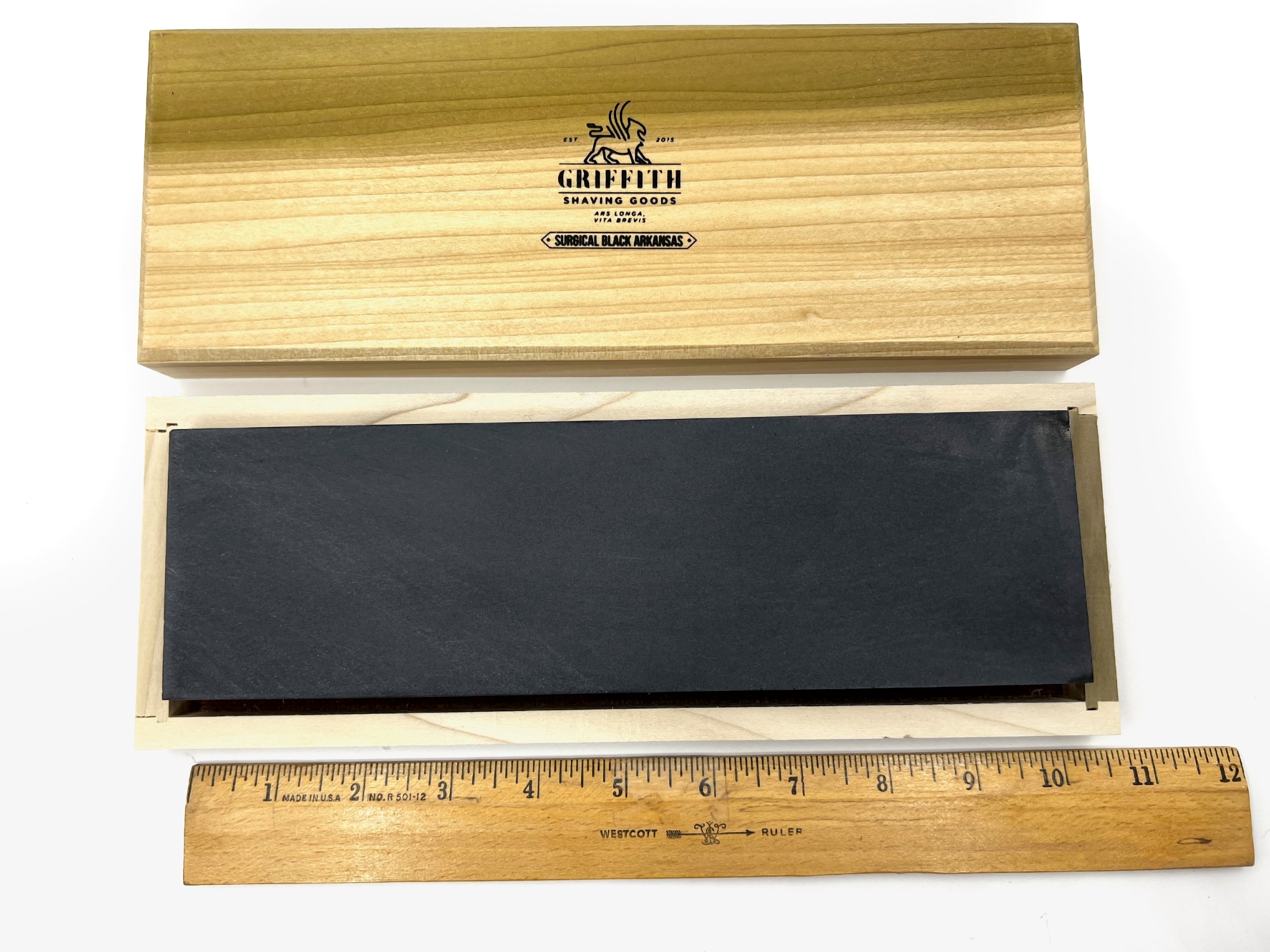 Our heirloom-quality Arkansas Black Surgical Ultra-Fine 10" long x 3" wide x.075" thick American Finishing Razor Hone Sharapening Stone is a luxurious sharpening tool that will last a lifetime or more. This exquisite historical whetstone is mined only from the Ouachita Mountain region of Central Arkansas, and with it's fine grit, it can put a surgical quality edge on any blade. Each one is packaged in a beautiful, handcrafted hardwood box, making it the perfect gift for any connoisseur of quality tools. Experience the best of American sharpening stones.