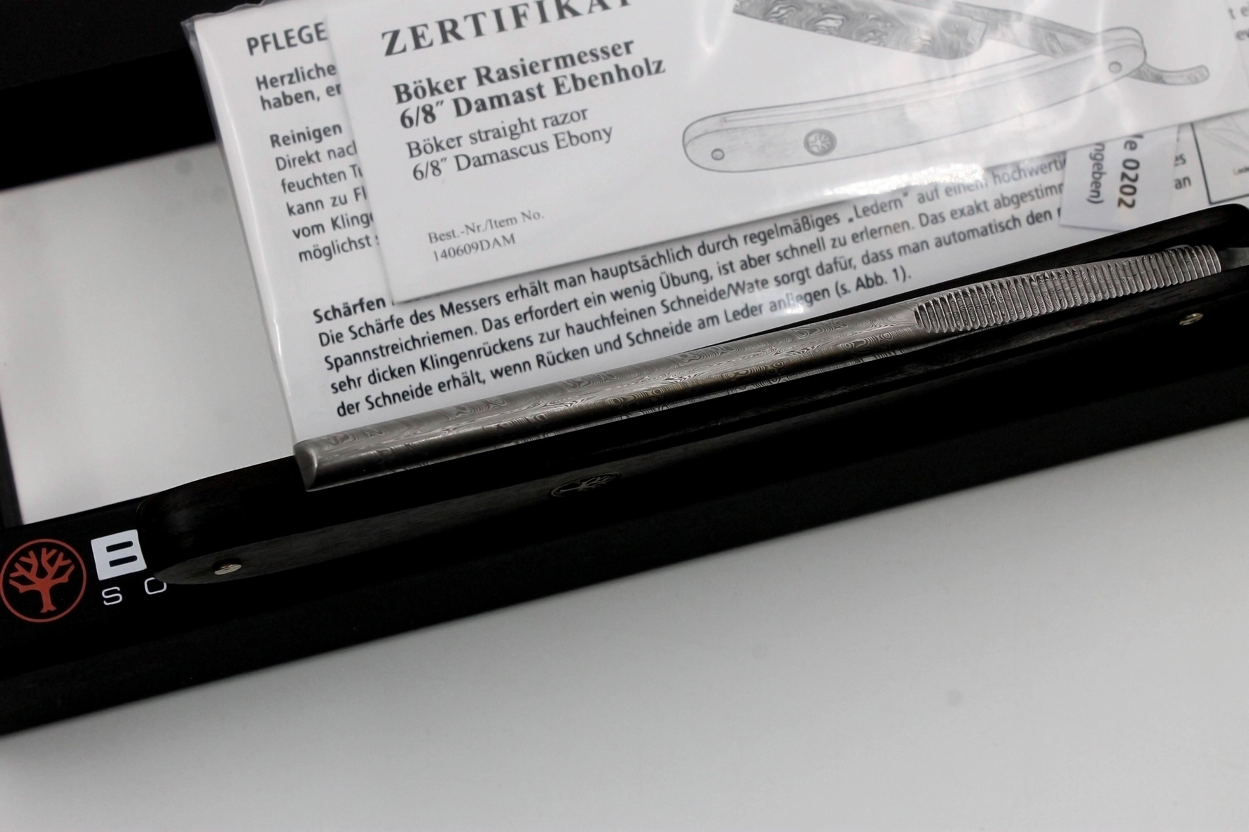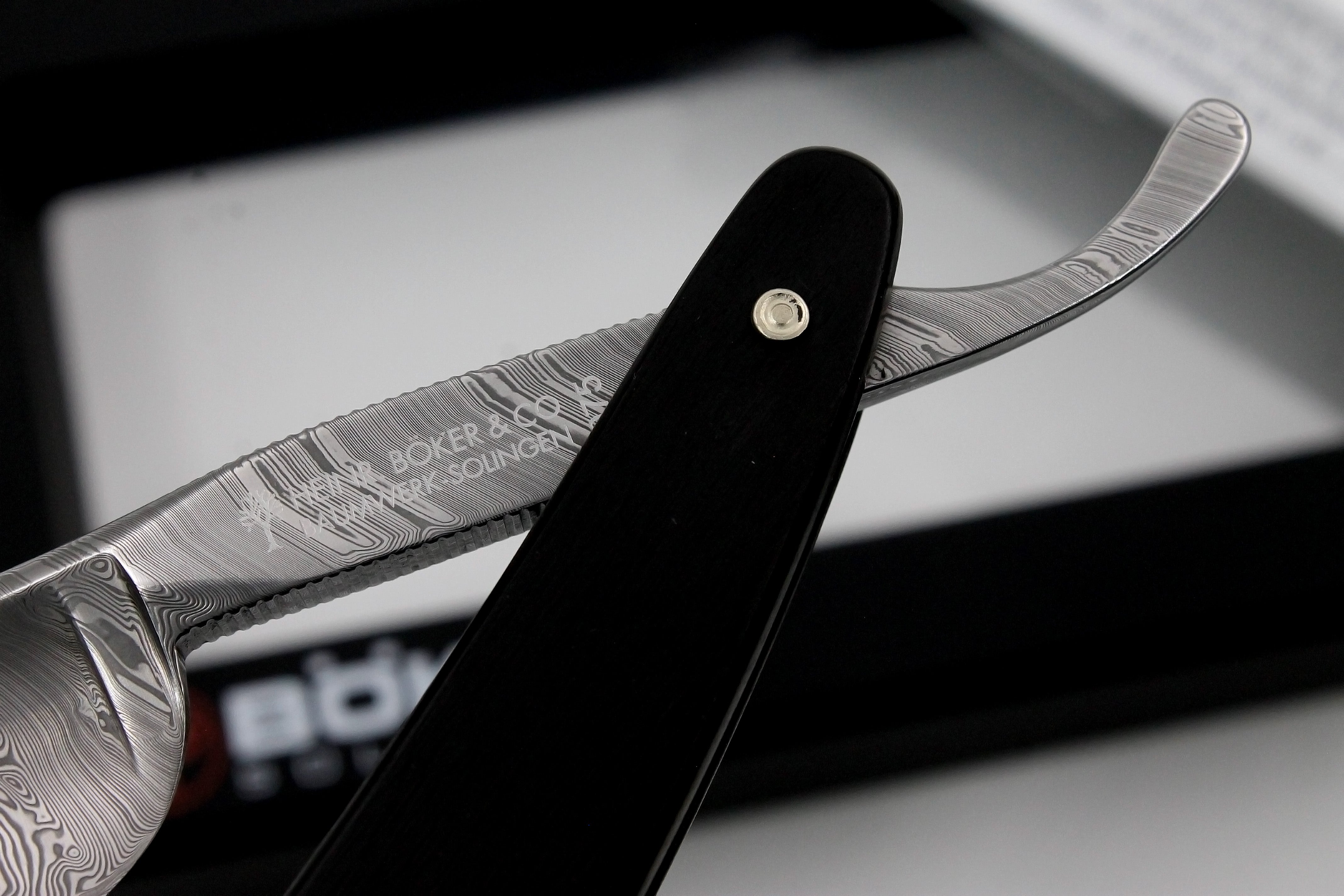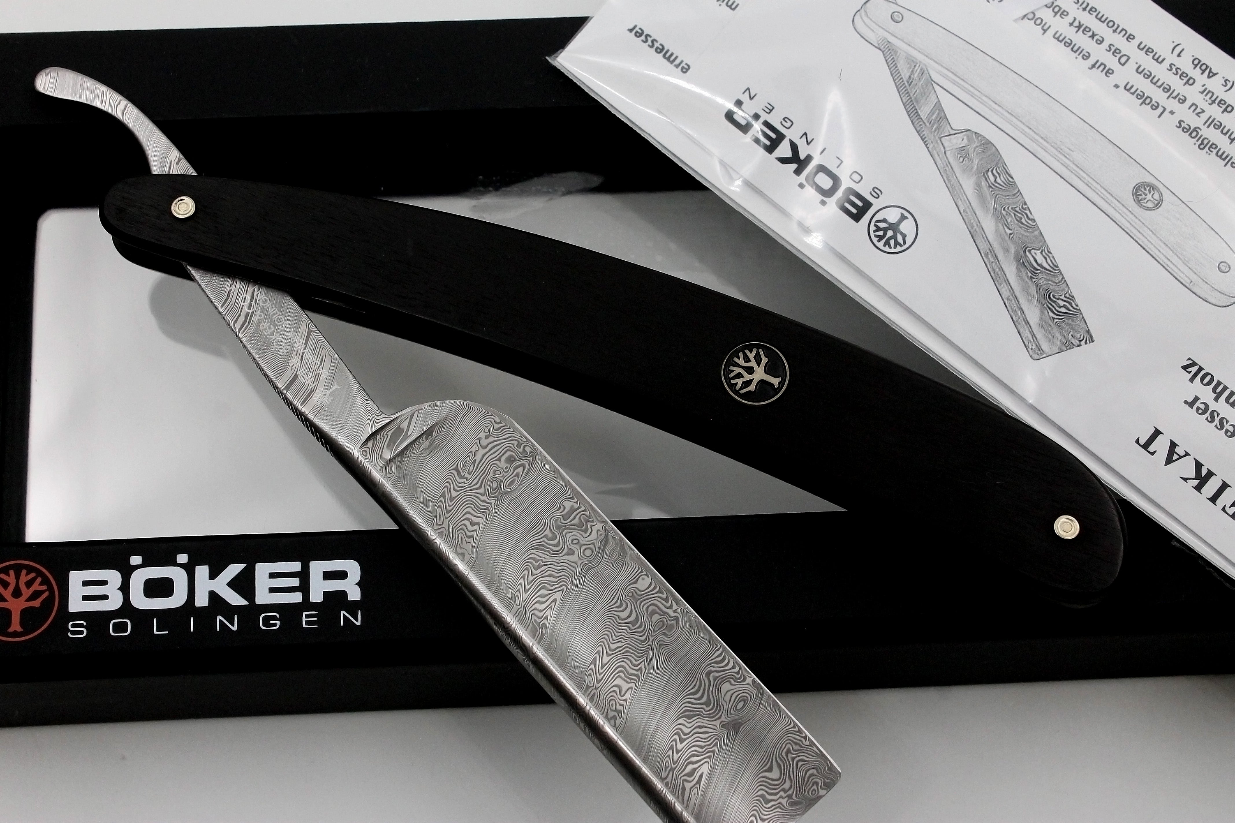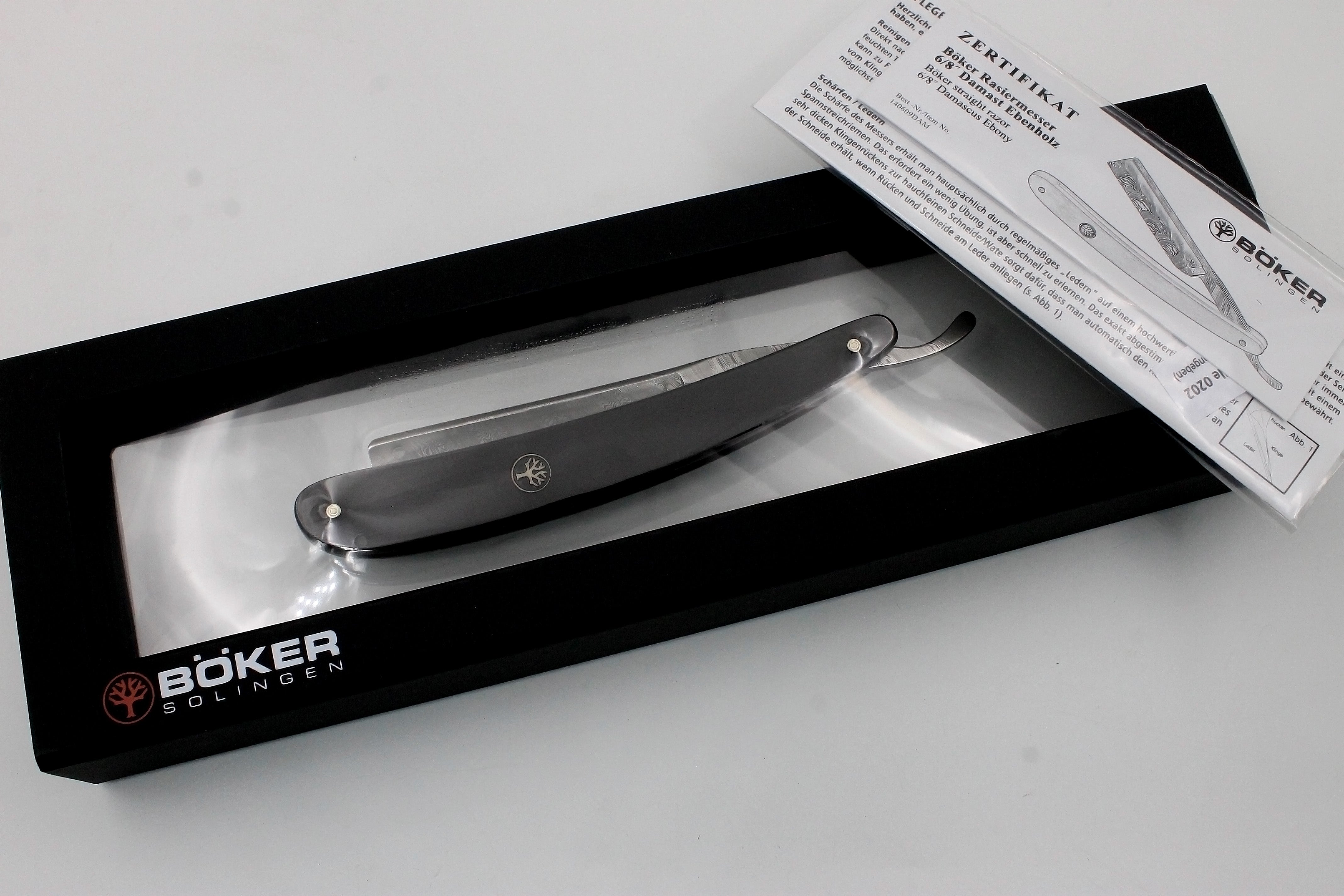 "The dark color and fine grain of the precious wood emphasize the elegance and noble appearance of this unique piece of craftsmanship. Thanks to its high density, the certified imported ebony is a preferred choice for its wonderful resistance to aging as much as for its decorative applications. The tang features jimping on both sides and as an additional decoration, the historical Boker tree emblem is expertly inserted into the handle. With authentic Boker laser engraving in the blade passage, certificate of authenticity and attractive floating display complete a razor of craftsmanship that is rarely found nowadays. Handmade in the Boker knife manufactory Solingen"