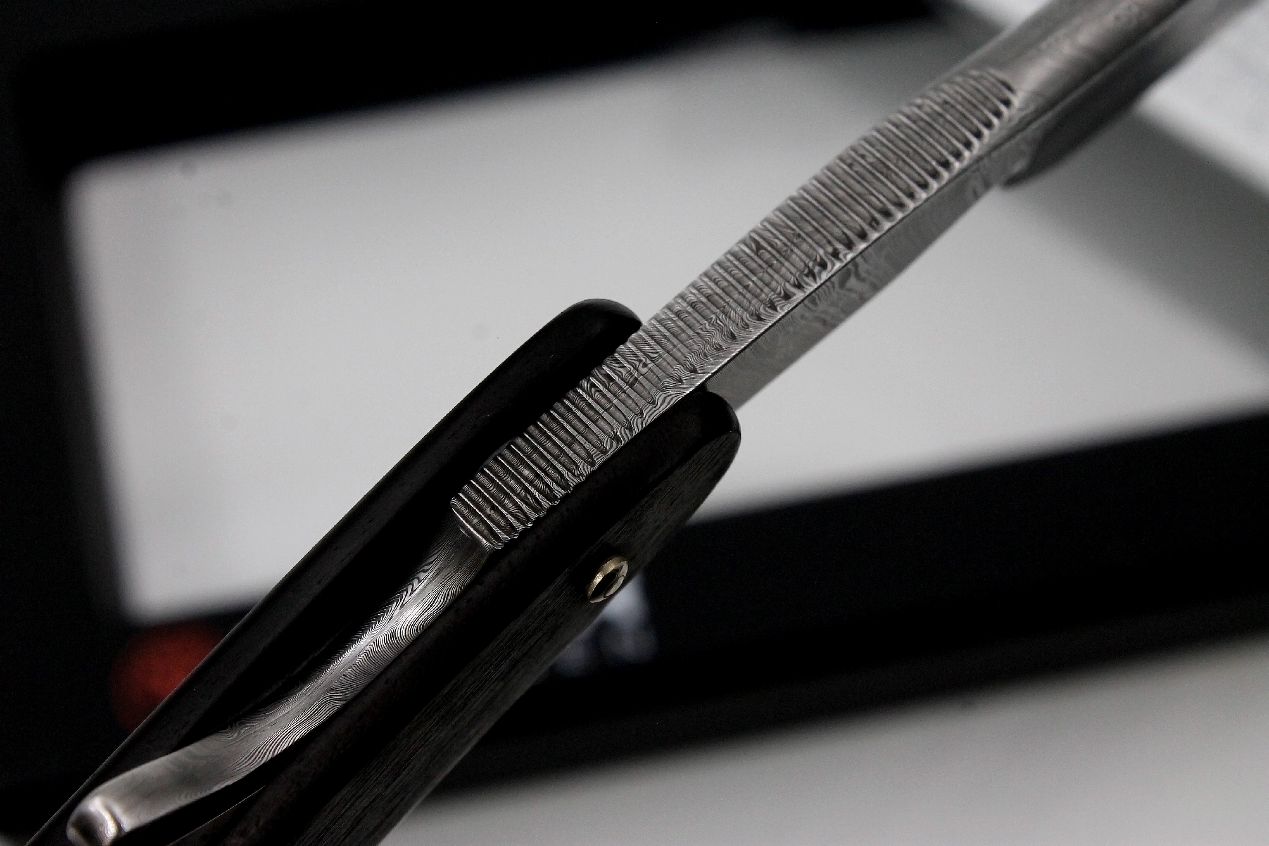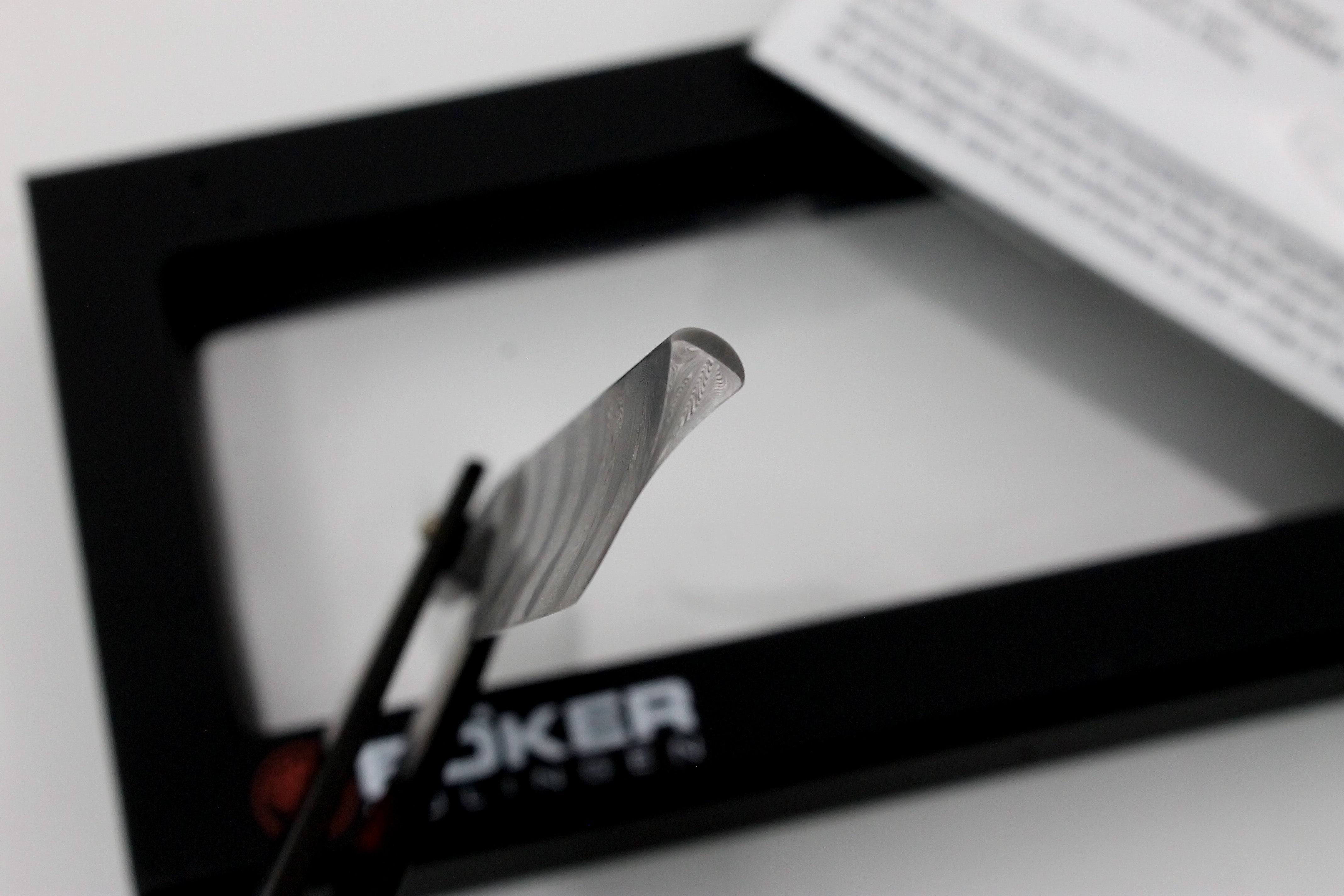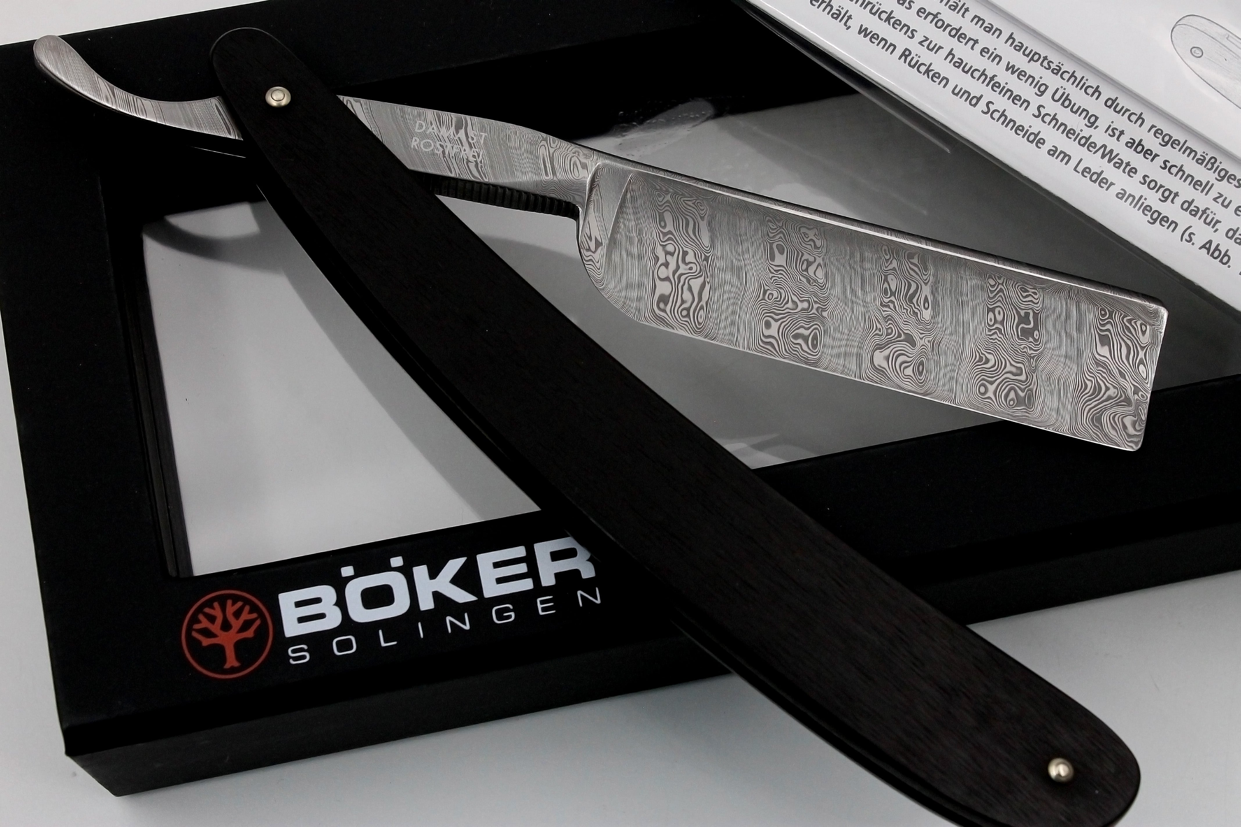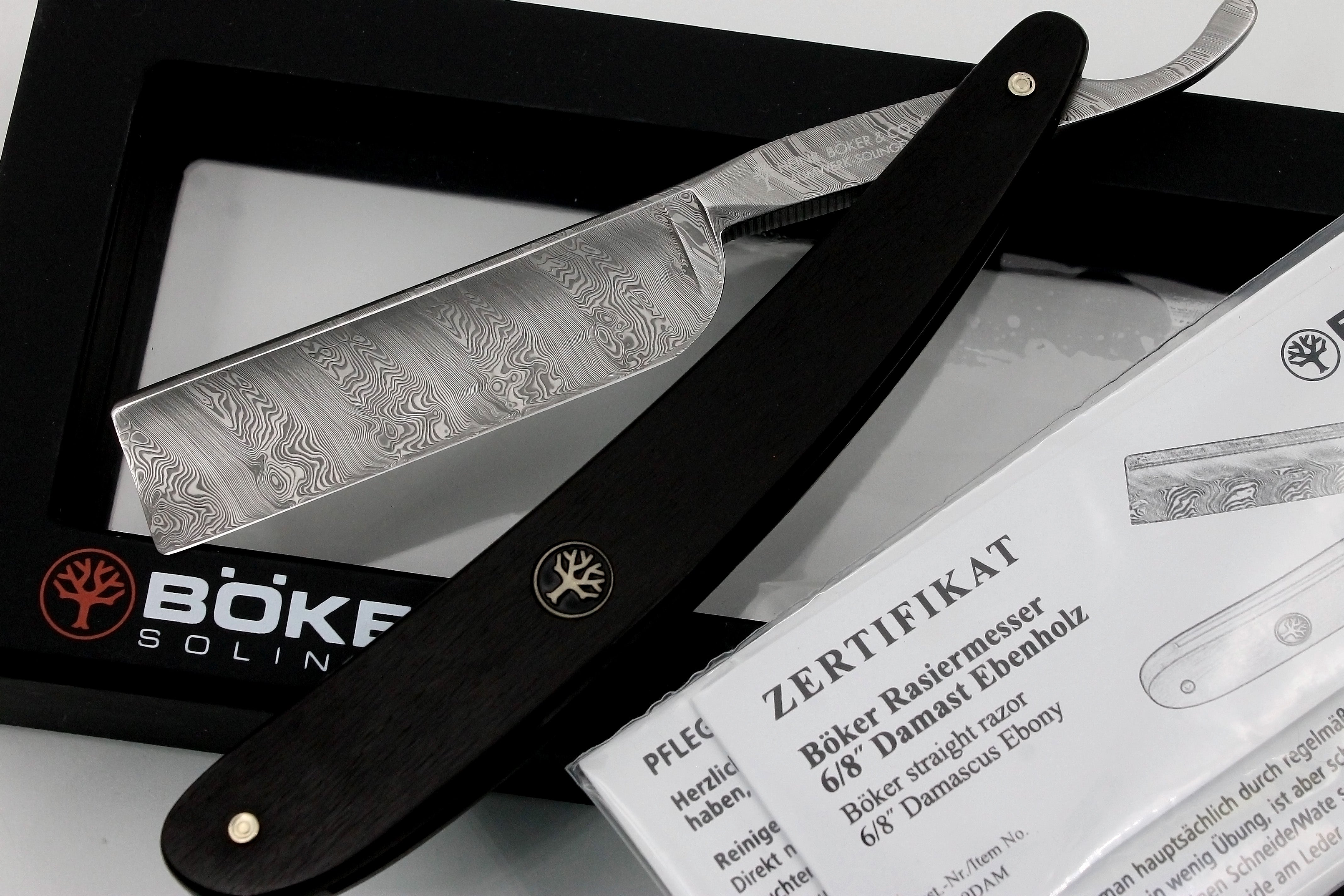 "The dark color and fine grain of the precious wood emphasize the elegance and noble appearance of this unique piece of craftsmanship. Thanks to its high density, the certified imported ebony is a preferred choice for its wonderful resistance to aging as much as for its decorative applications. The tang features jimping on both sides and as an additional decoration, the historical Boker tree emblem is expertly inserted into the handle. With authentic Boker laser engraving in the blade passage, certificate of authenticity and attractive floating display complete a razor of craftsmanship that is rarely found nowadays. Handmade in the Boker knife manufactory Solingen"