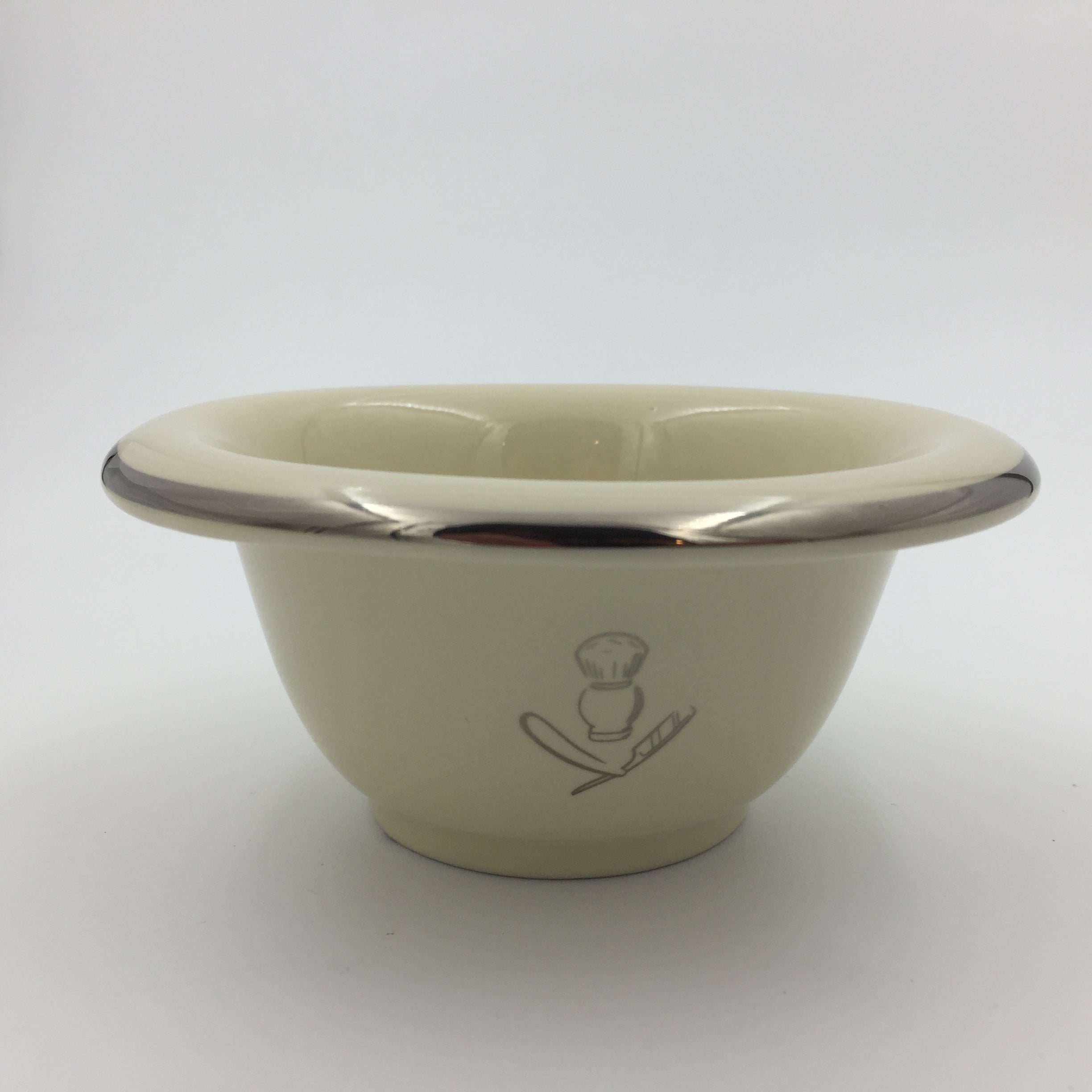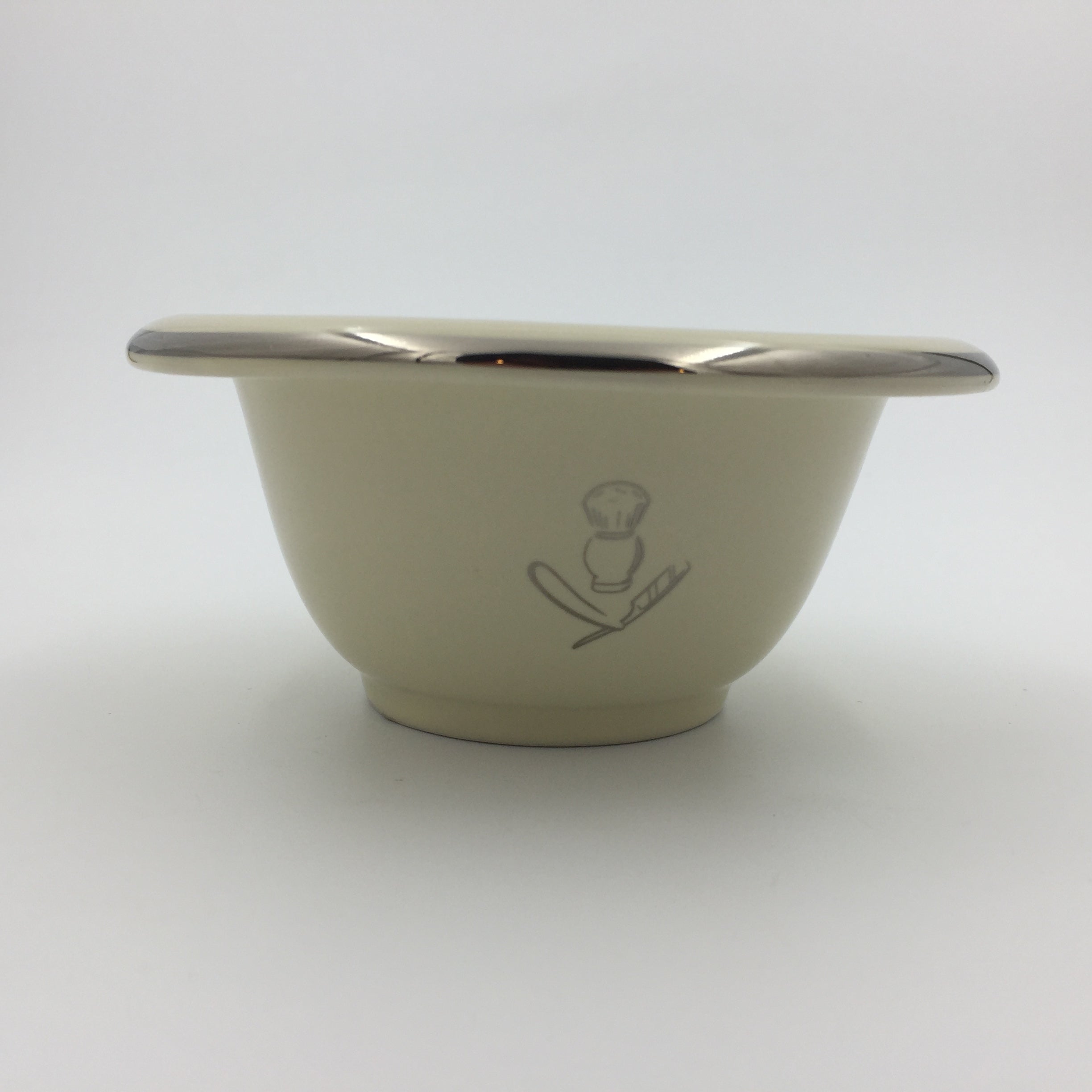 This bowl is just what you need to lather up your favorite shaving cream or soap with your shaving brush. Made of high quality ceramic, this bowl features a silver trim on the edge and an illustration of a shaving brush and straight razor on one side. This traditional design fits well into any bathroom or shave den decor. Also available in black.
