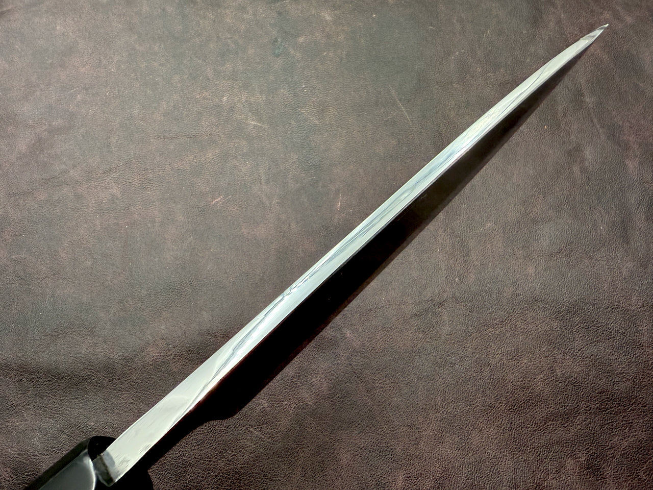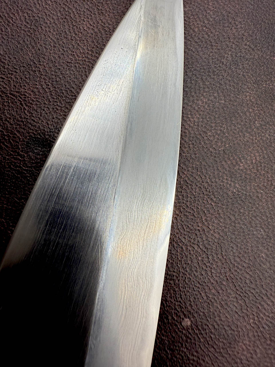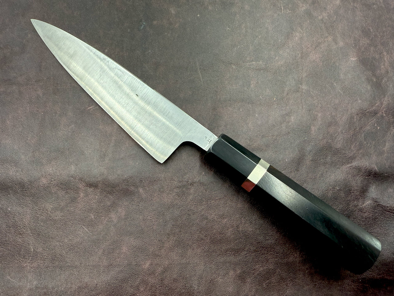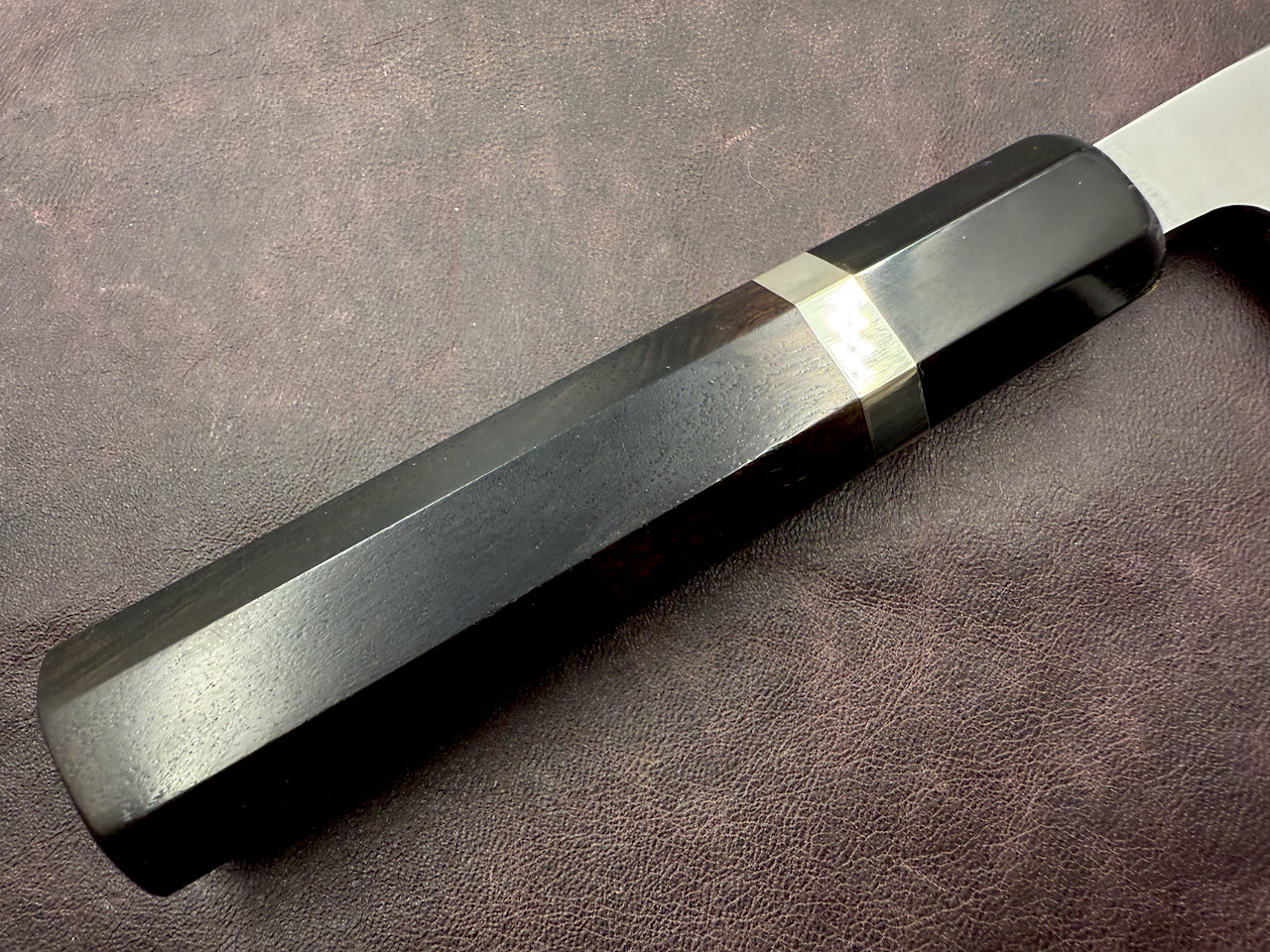 Beautiful wrought iron like layering effect presented itself upon natural stone sharpening. This old Mioroshi Deba is a combination of Yanagiba and Deba. This gives the knife a bit of versatility being more thin, light and short than a traditional Deba. The traditional use for this knife would be breaking down smaller fish with one knife. They can also be used as all purpose petty or paring knives. The knife is single bevel and is meant only for right handed users. The front side is ground with the wide bevel and backside or Ura is flat around the perimeter of the knife and hollow in the middle. This knife is extremely old and it's wrought iron cladding makes this evident. The sharpening feel is buttery and addictive with the wrought iron cladding extremely soft and the Hagane, which I believe to be white steel is expertly treated and sharpening is a true pleasure. The knife is unmarked and only adds to the mystery of its origins. This knife is razor sharp and ready to use and polish with significantly improved fit and finish on the spine and choil as well. The custom Ebony handle with spacer and buffalo horn ferrule completes this historical package with class and finesse. The steel is extremely easy to sharpen and takes an ultra keen edge in no time. It behaves a lot like Shirogami #1 treated very hard, similar to Teruyasu Fujiwara's treatment of Shirogami #1.