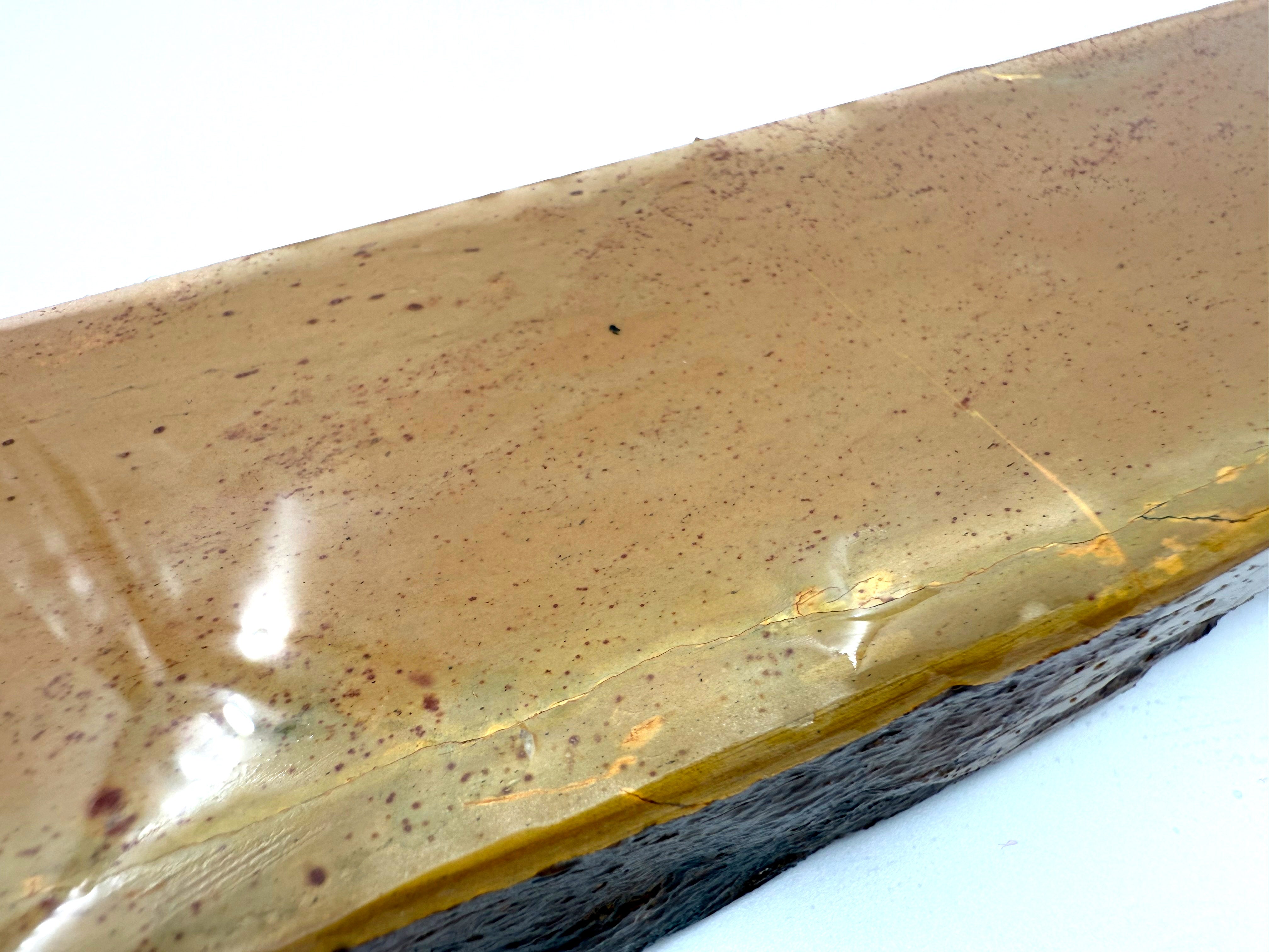 This giant San sized Akapin stone from the Aiiwatani is spectacular to hone razors/Kamisori with. While softer, it finishes quite fine and bright for it's softer nature. Covered in Red Nashiji (pear skin) patterns, it self slurries easily with reddish/pink mud. This slurry is quite grit rich and removing medium grit scratches is rather quick and easy. When honing razors, care must be taken to manage the slurry viscosity. slurry must be kept thin and hydrated throughout the process to yield the finest edge possible.