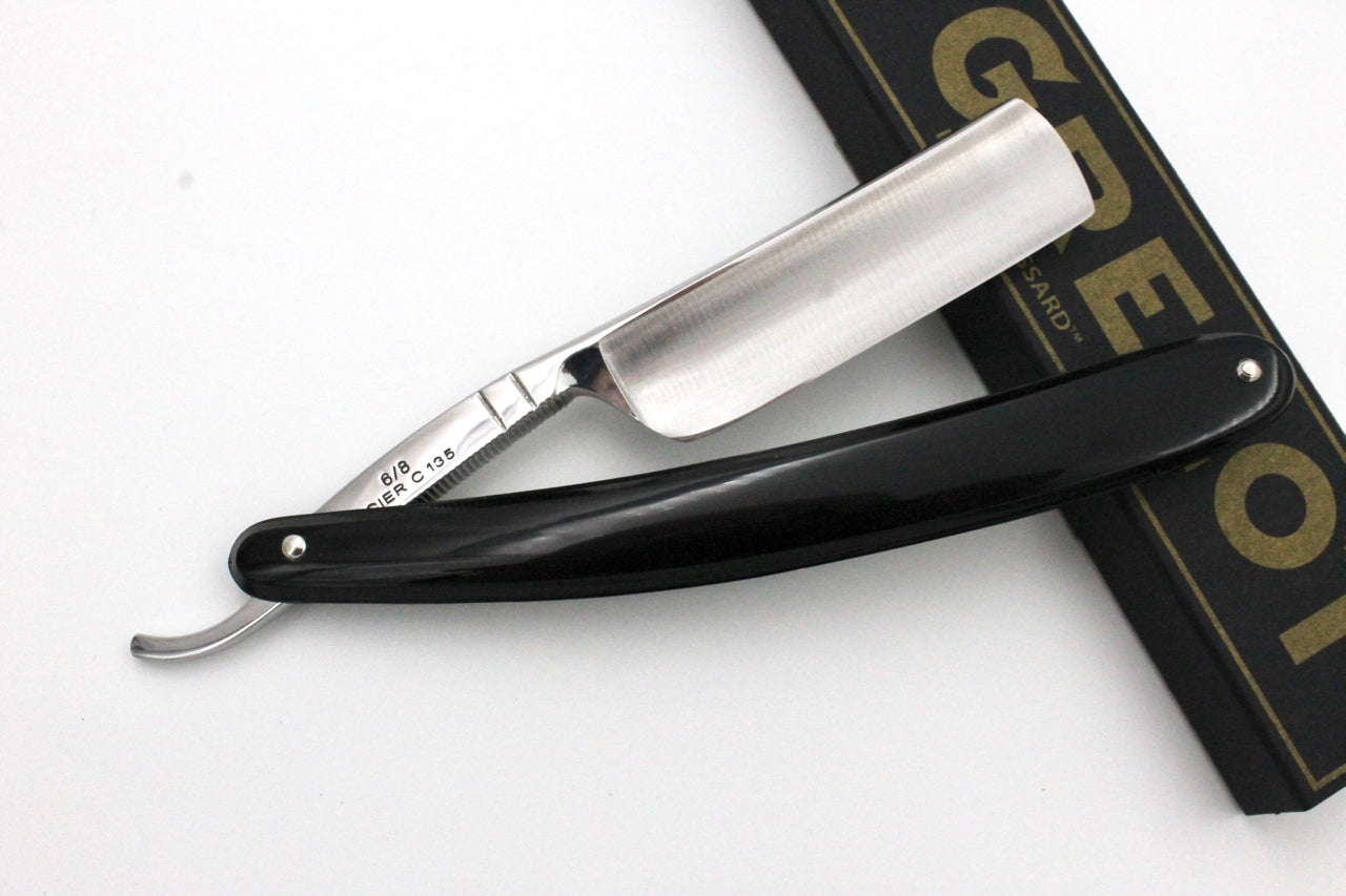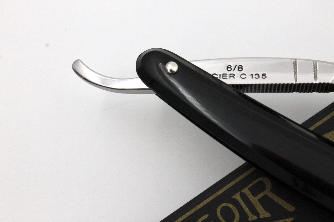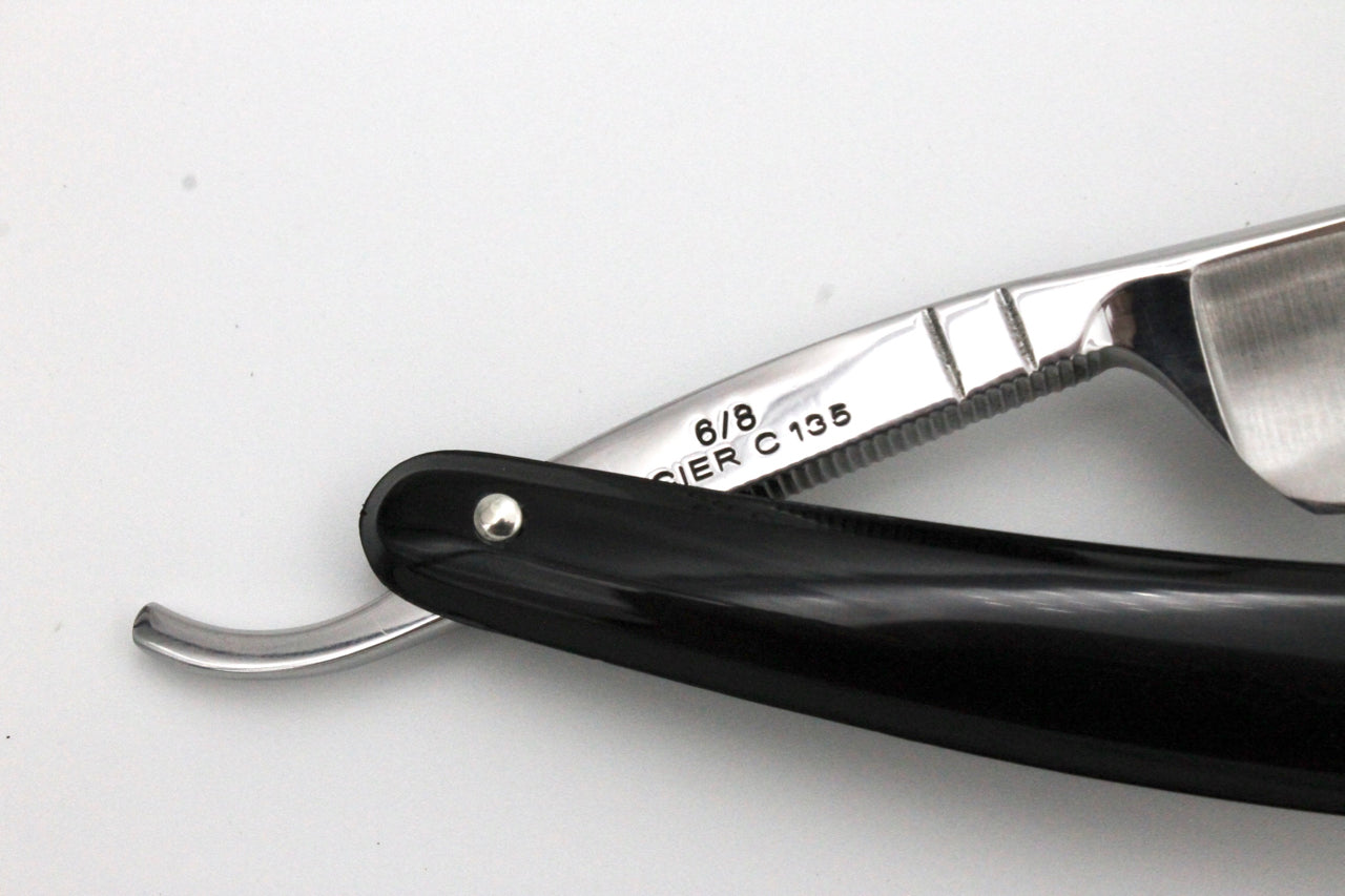 This 6/8 "Le Grelot" brand razor manufactured by Thiers Issued features a c135 Carbonsong steel full hollow ground blade with a detailed etch, satin blade faces with mirror polished spine and tang, round tip and lower jimping. The razor scales are made from high quality and durable black resin with a high gloss. Each razor comes in a vintage inspired paperboard box.