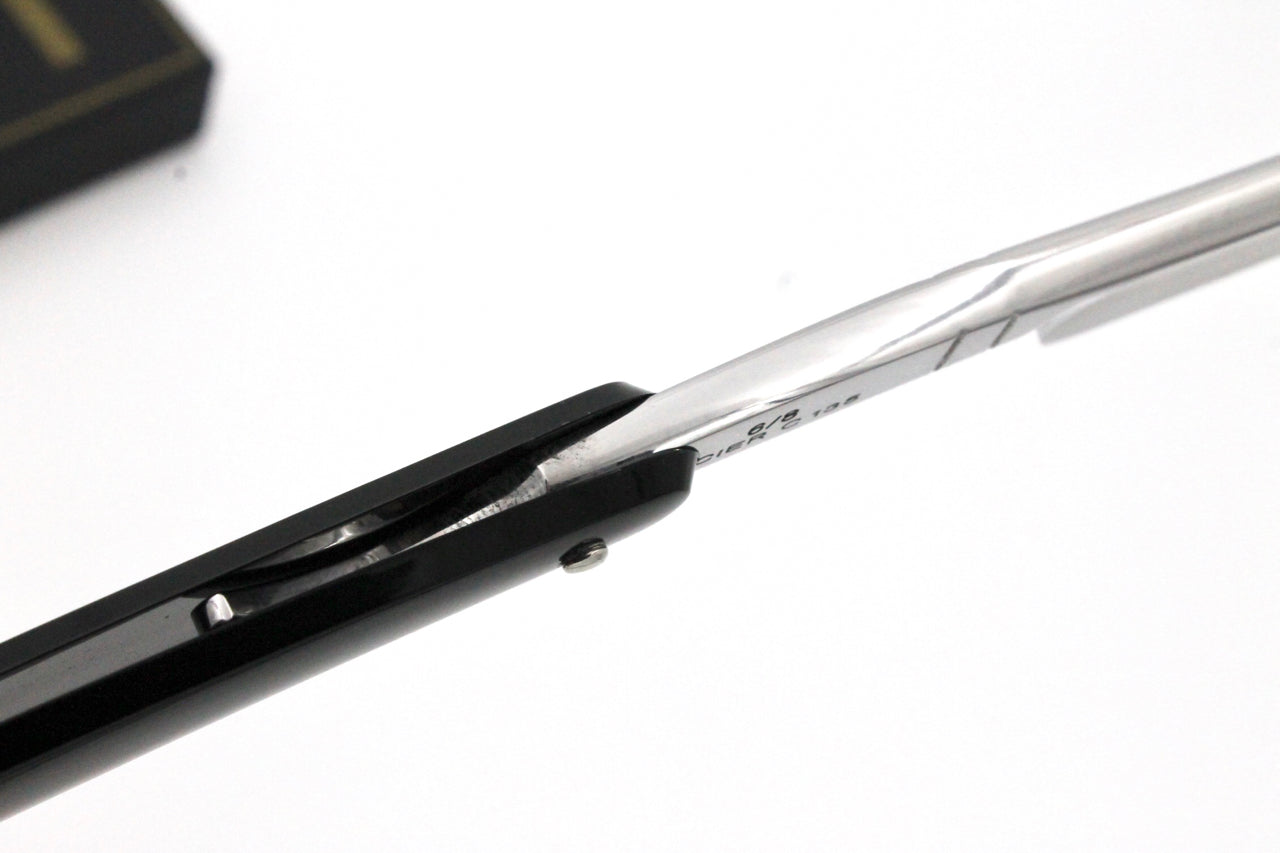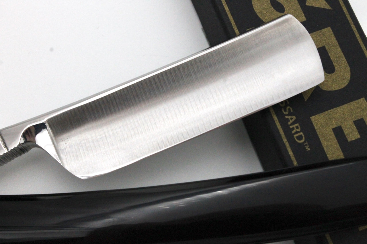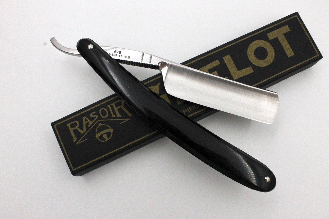This 6/8 "Le Grelot" brand razor manufactured by Thiers Issued features a c135 Carbonsong steel full hollow ground blade with a detailed etch, satin blade faces with mirror polished spine and tang, round tip and lower jimping. The razor scales are made from high quality and durable black resin with a high gloss. Each razor comes in a vintage inspired paperboard box.