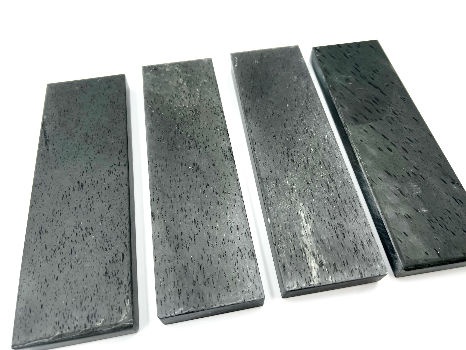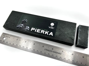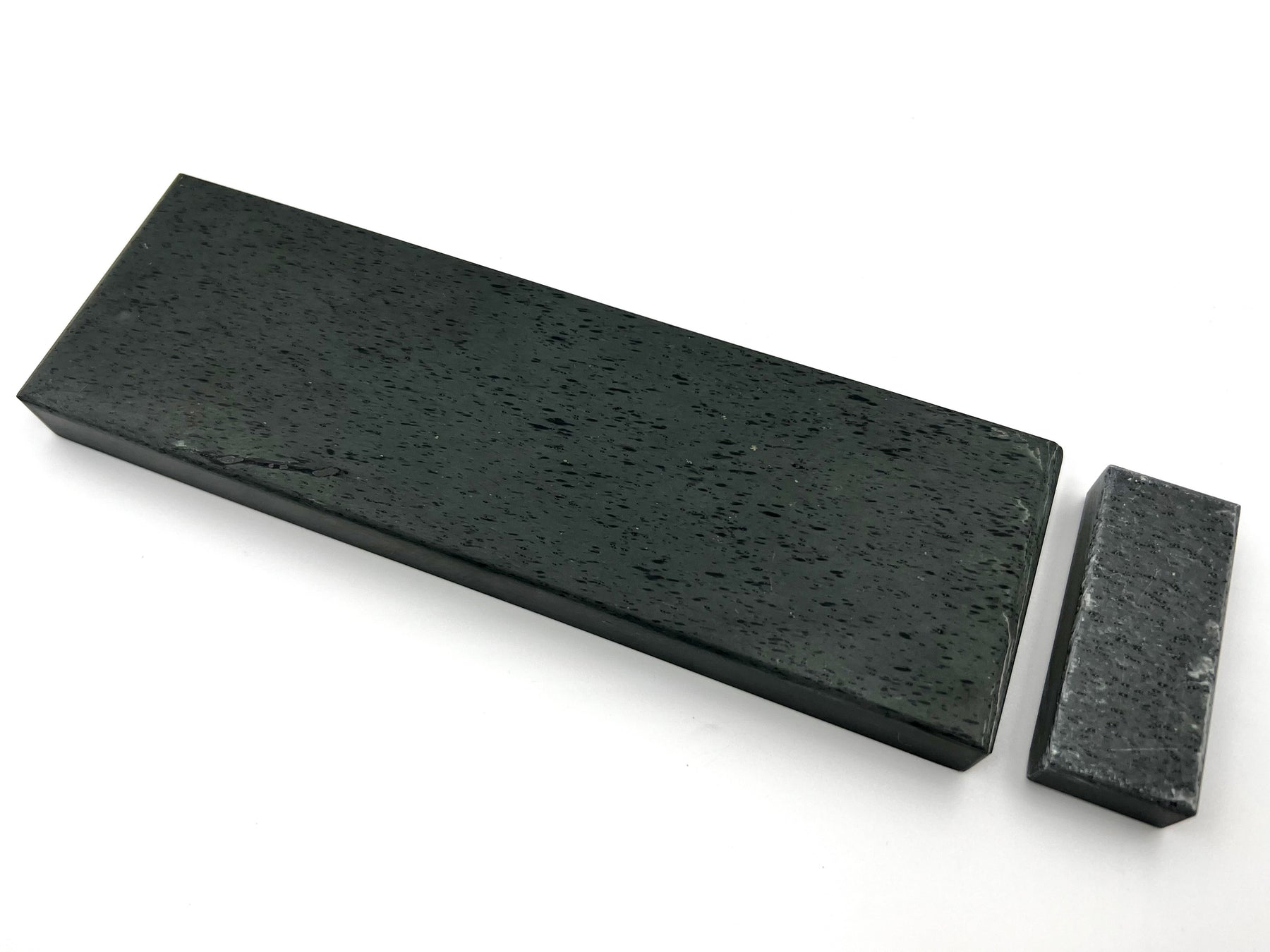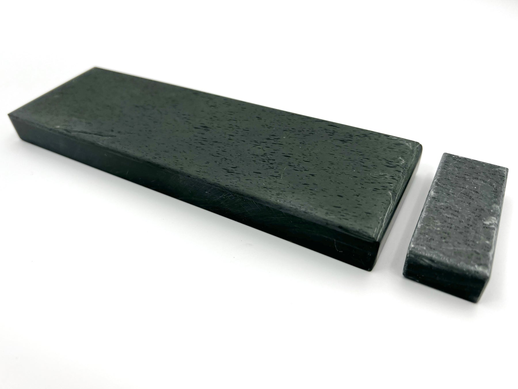 Stone Description: The Pierka stone performs akin to an 8000 grit water stone, achieving a high polish. Its dark greenish-gray appearance boasts a smooth, robust texture, and its surface exhibits open pores resembling wood grain. When lightly tapped, it emits a distinct ringing sound, and it retains minimal water while providing excellent tactile feedback.