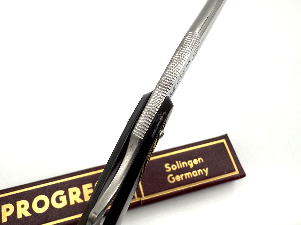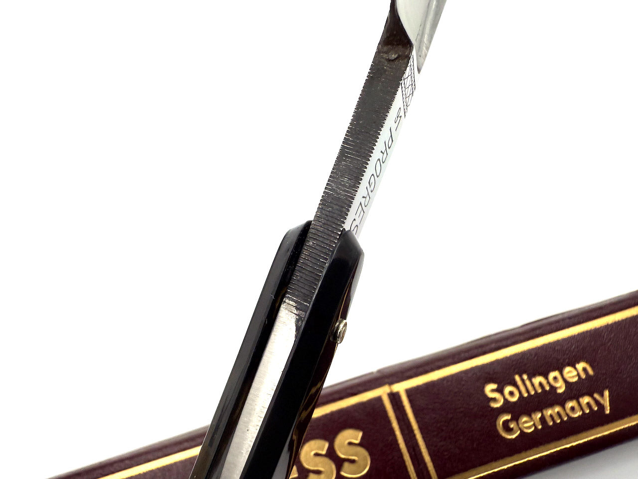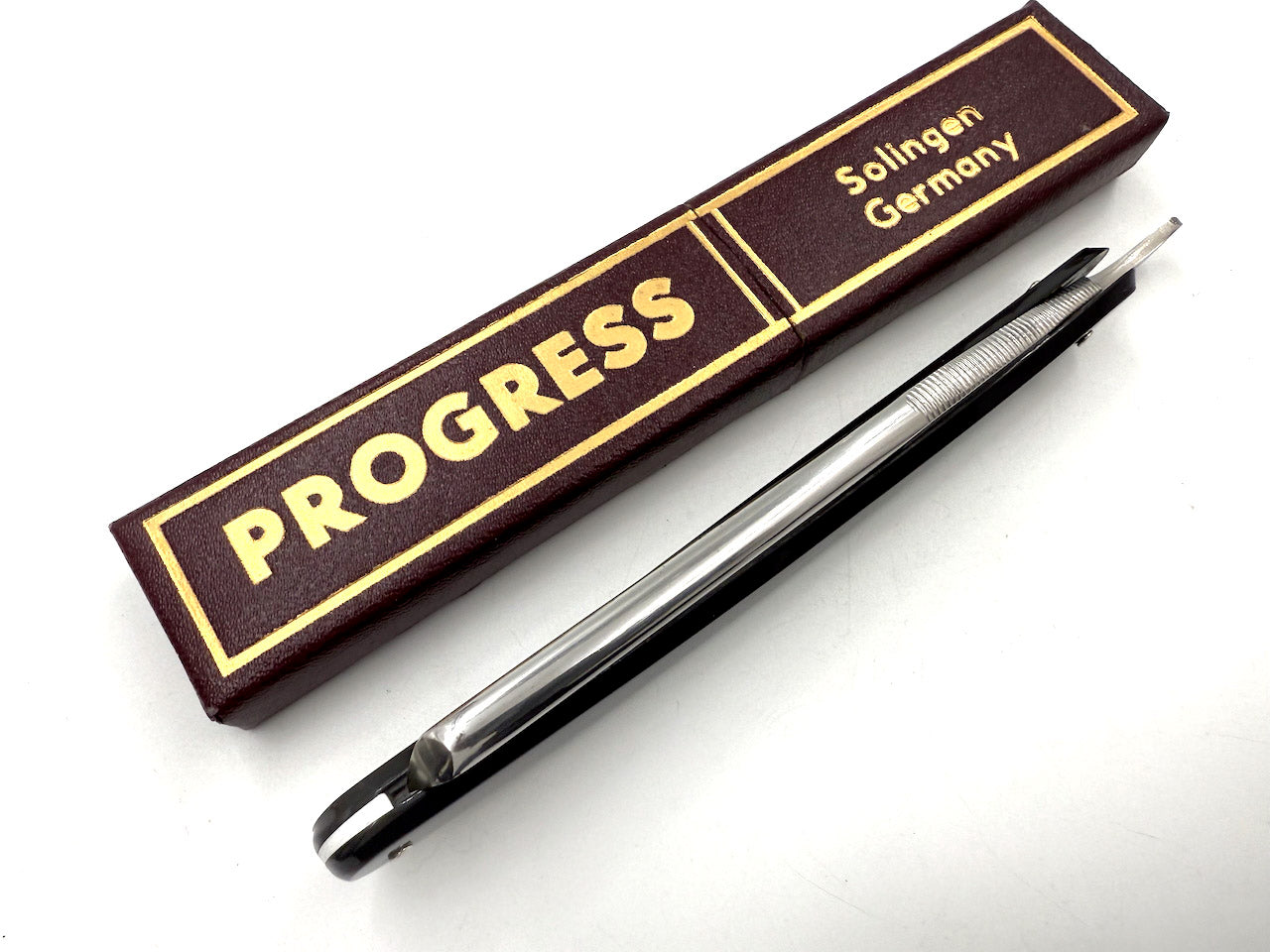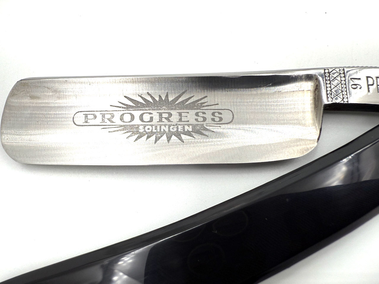 We have been very fortunate to get some of these old Progress razors ground by Solingen's best grinders. On the examples for sale here, the original celluloid scales had developed some cracks dues to age so we have removed them and replaced with modern Solingen plastic scales. The blades were also fully cleaned, honed to a shave ready state and sanitized in Barbicide.