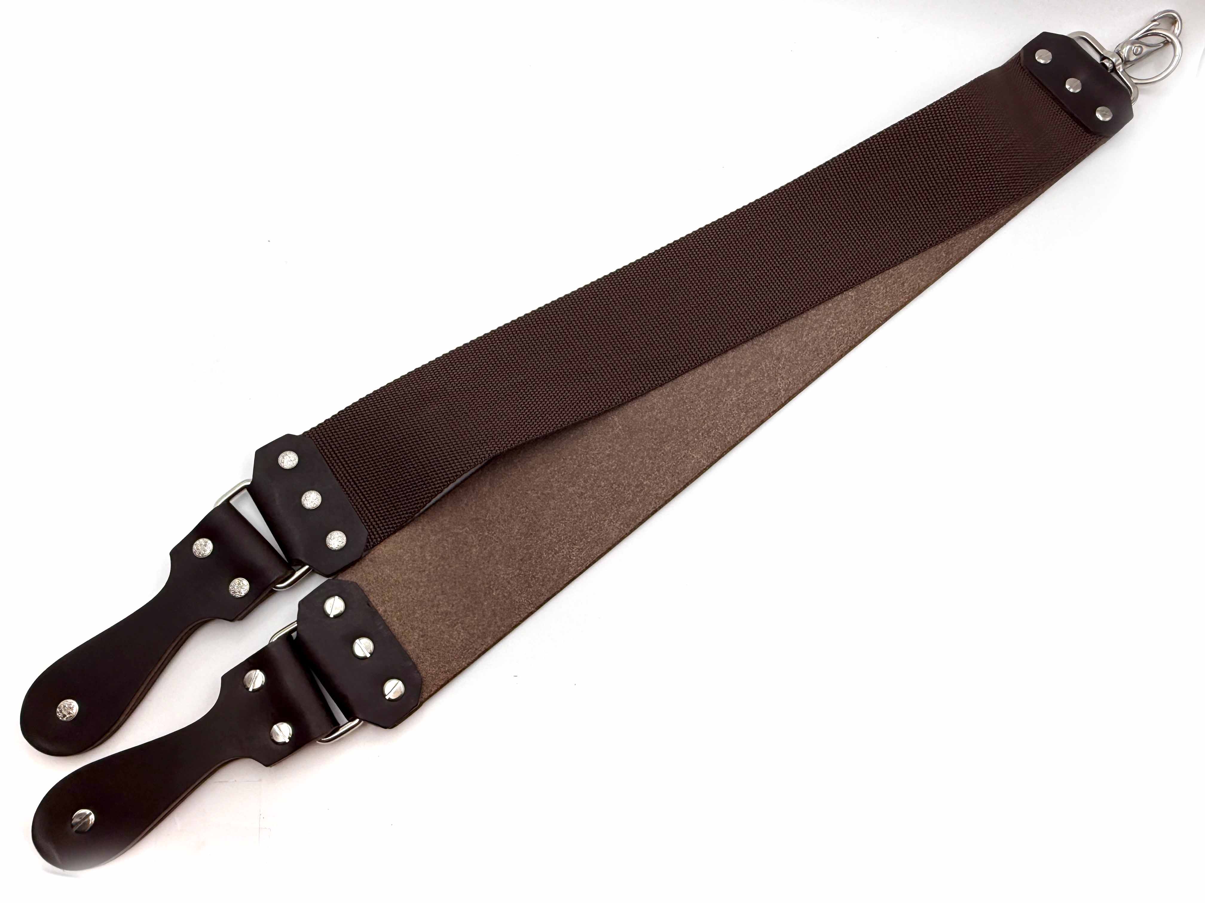A dual component strop with English bridle leather side and cotton "linen" sides, each with a 17 inch long stropping area and 3 inch width.