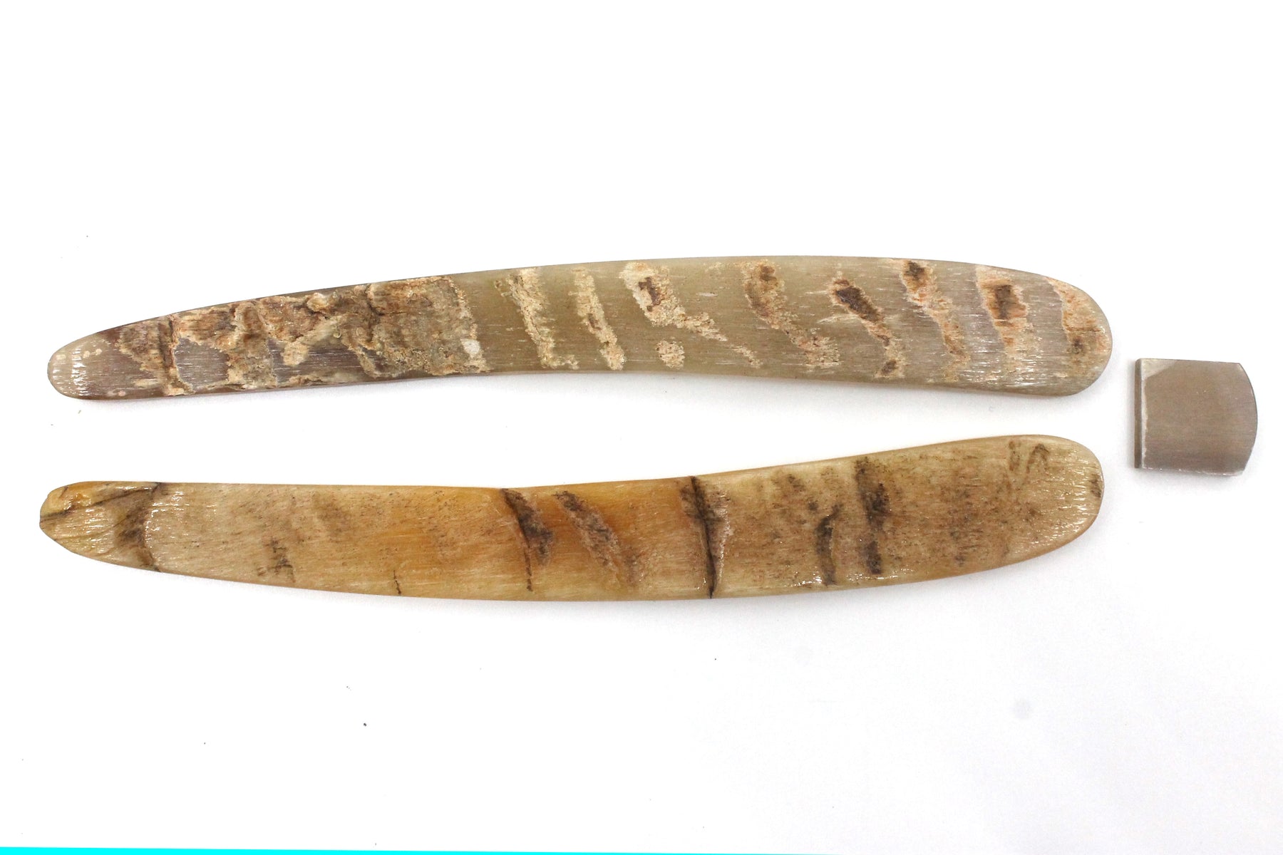 Note that while the scales may arrive with slight natural curvature that is usually negated once pinned together. If additional adjustment is needed to fit your blade, slight heating in very hot water will render them pliable for easy adjustment.