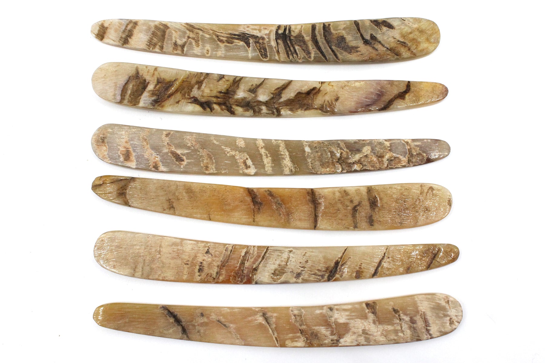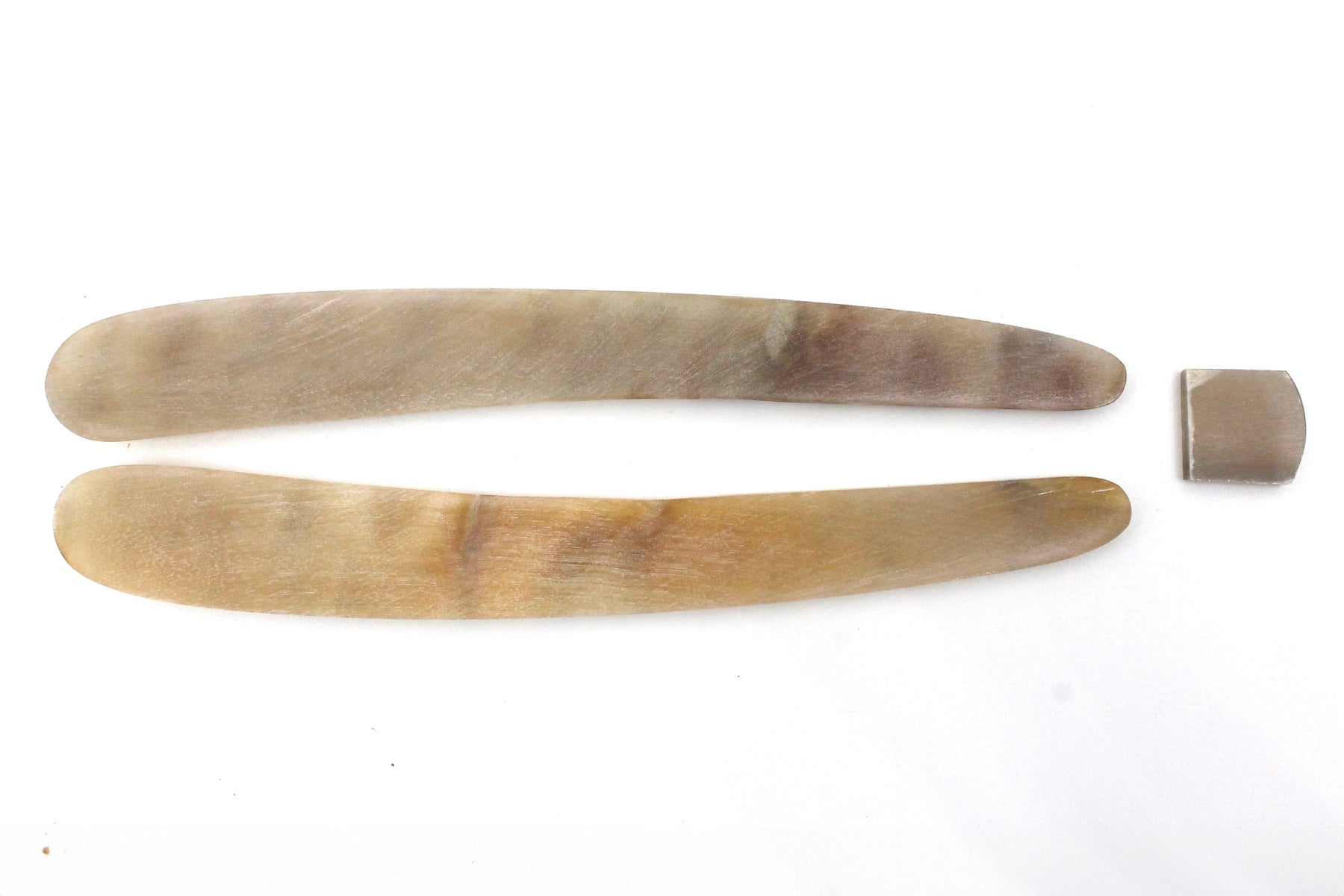 These razor scales are made to our specifications in India by a high quality manufacturer. They are sized specifically for 5/8-6/8 blades and possibly smaller or larger depending upon blade shape. Measuring at about 3mm thick, they are not too heavy and well finished. A black horn spacer wedge is included which can be sanded down to correct wedge shape and thickness to suit your blade. The inside surfaces of the scales are roughly sanded and can be left as-is or further sanded and polished if desired. The template for these scales is shown, though shape will vary slightly as these are hand made.